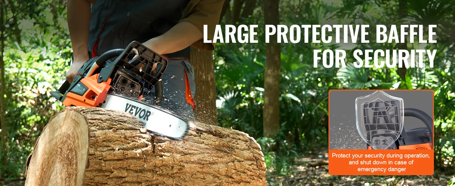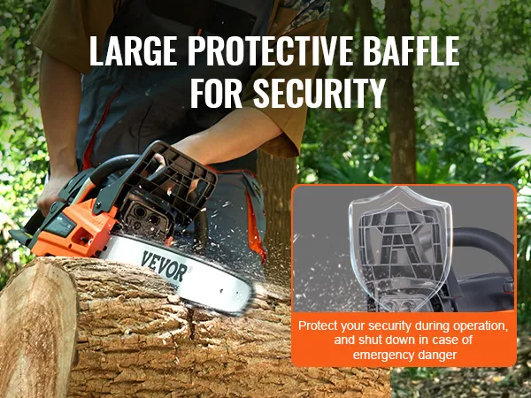 Blijf veilig met de grote beschermende behuizing van onze benzinekettingzaag. Het houdt zaagsel weg, zodat je veilig kunt werken en je handen kunt beschermen.