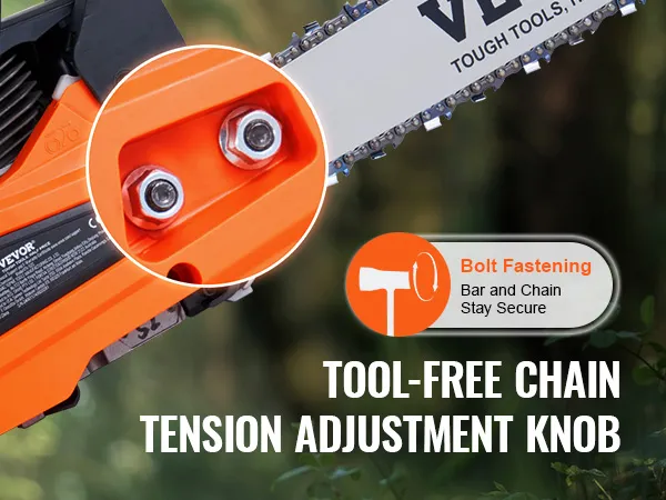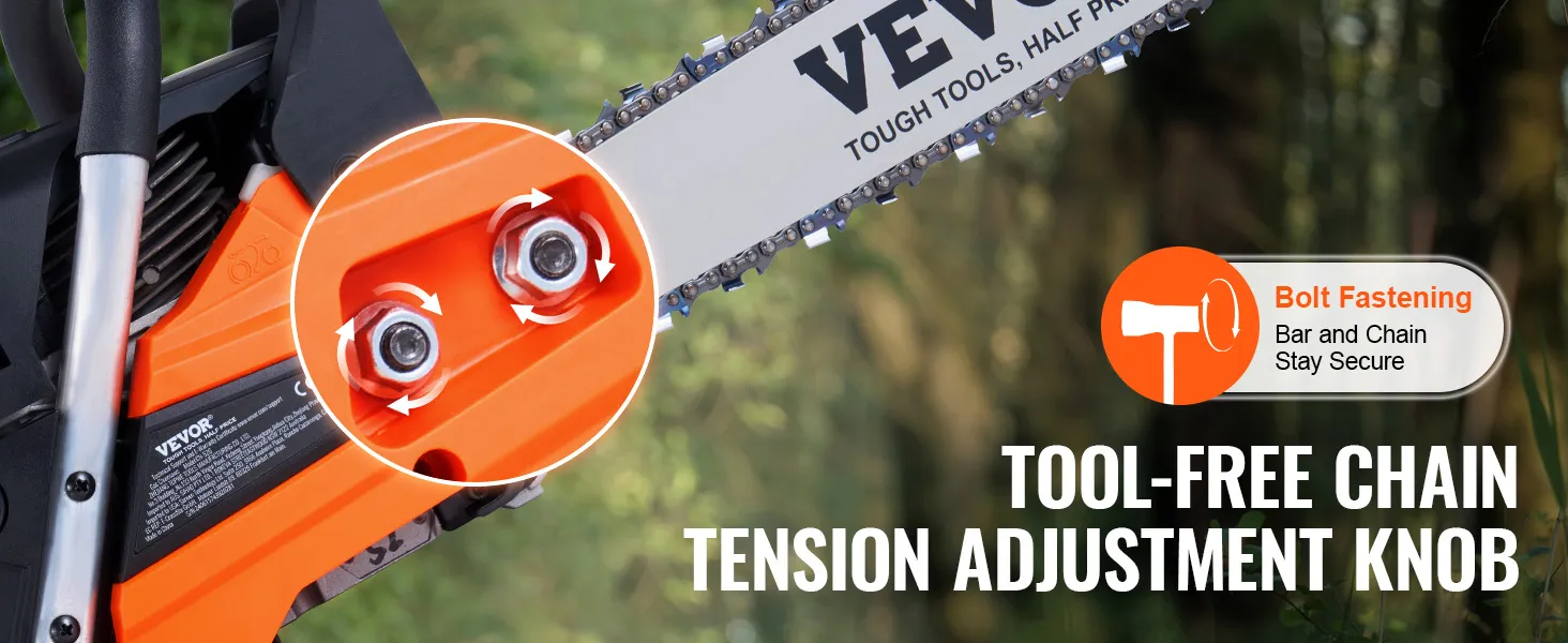 Pas de kettingspanning snel en eenvoudig aan met de gereedschapsloze knop. Dankzij de veilige schroefverbinding blijven het zaagblad en de ketting stevig op hun plek zitten, waardoor je veiliger en efficiënter kunt zagen.