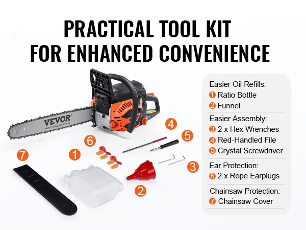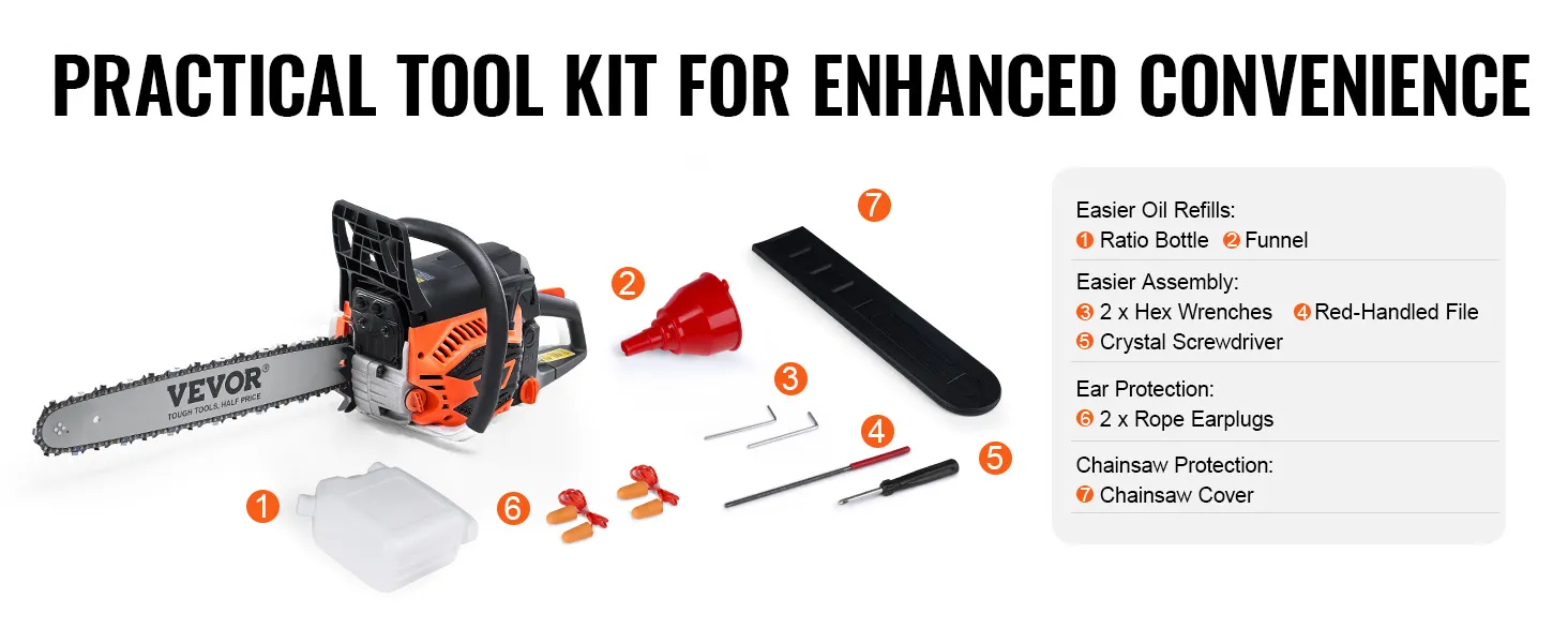 Geniet van een complete gereedschapsset waarmee tanken, instellen en onderhouden een fluitje van een cent wordt. Alles wat u nodig heeft om uw benzinekettingzaag in topvorm te houden, wordt meegeleverd.
