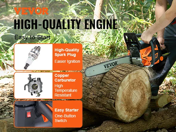 Met de easy start-functie van onze benzinekettingzaag kun je binnen een mum van tijd aan de slag. Druk gewoon op de knop en je bent klaar om te gaan. De premium bougie en messing carburateur zorgen keer op keer voor een soepele start, zelfs bij warm weer.