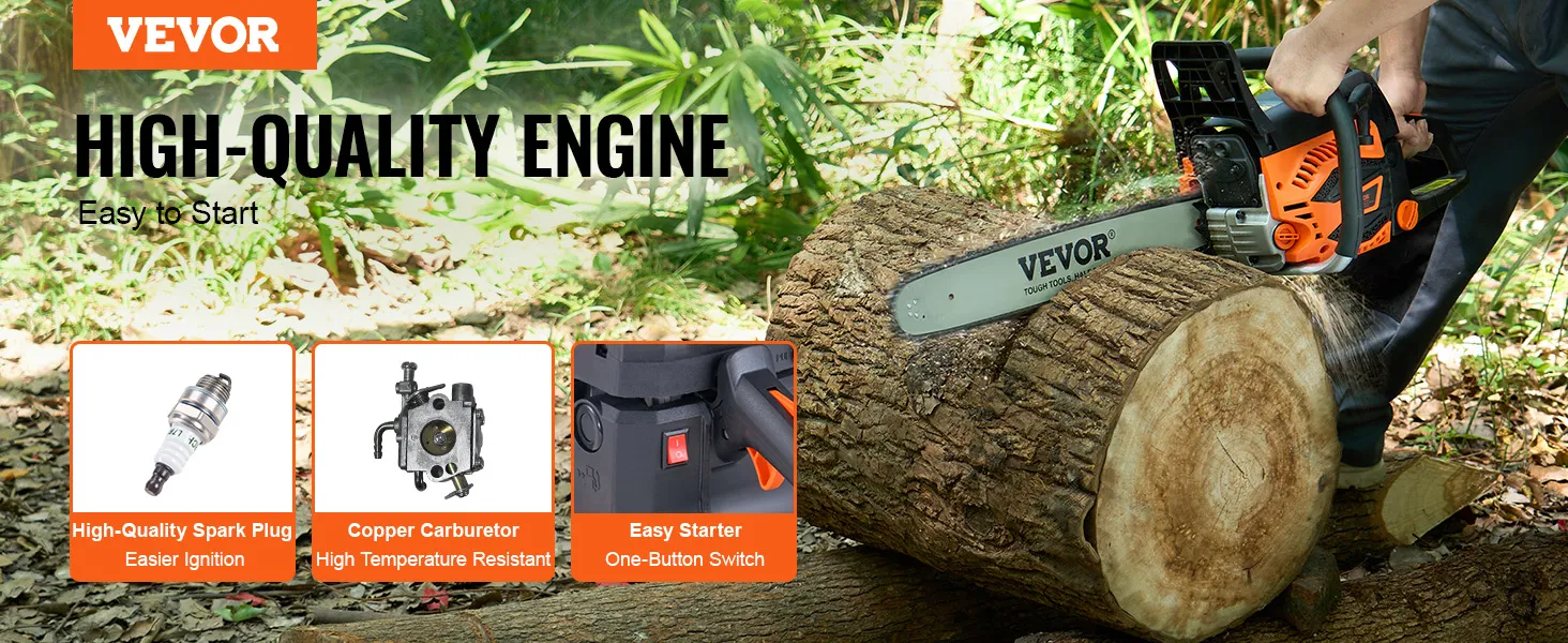 Krachtige prestaties: met een 58 CC-motor zaagt onze benzinekettingzaag gemakkelijk door hout zonder af te slaan. Met een vermogen van 3,22 pk, een motortoerental van 2,4 kW / 8500 tpm en een maximaal toerental tot 12.000 tpm geniet je door sterke prestaties van het ultieme bedieningsgevoel.