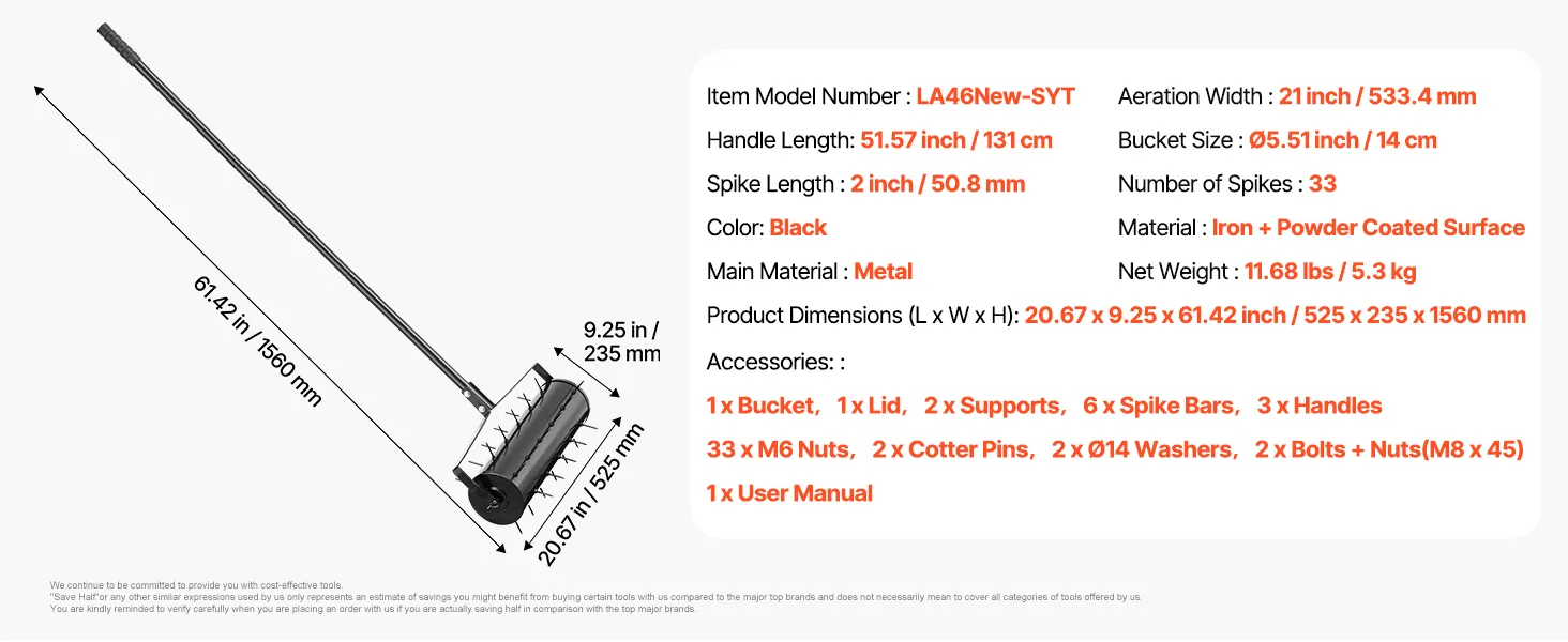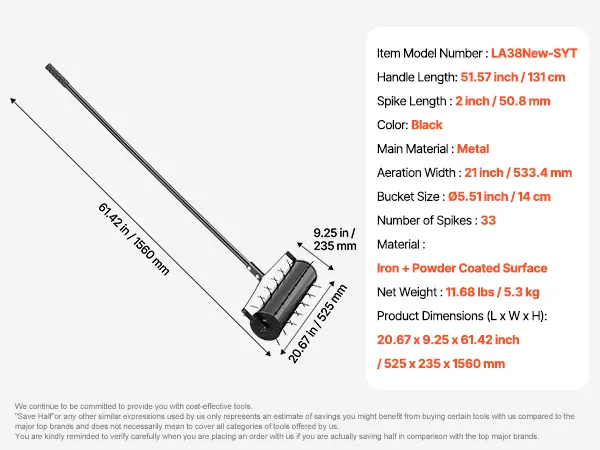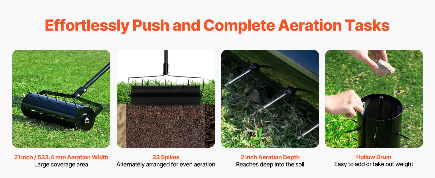 2-Inch Deep Aeration: The spikes on this manual lawn aerator are 2 inches long, with a diameter of 5.51 inches and 33 evenly distributed spikes across an 21-inch bucket. It easily penetrates sandy and grassy soils, allowing water and nutrients to reach plant roots and support healthy growth.