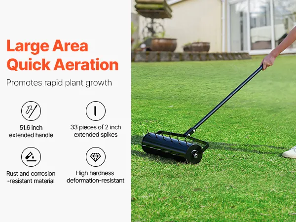 This rolling lawn aerator tool is designed for efficiency, with a large coverage area and even aeration to quickly treat soil, supporting healthy lawn and plant growth, and making soil management tasks easy.
