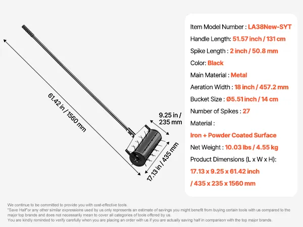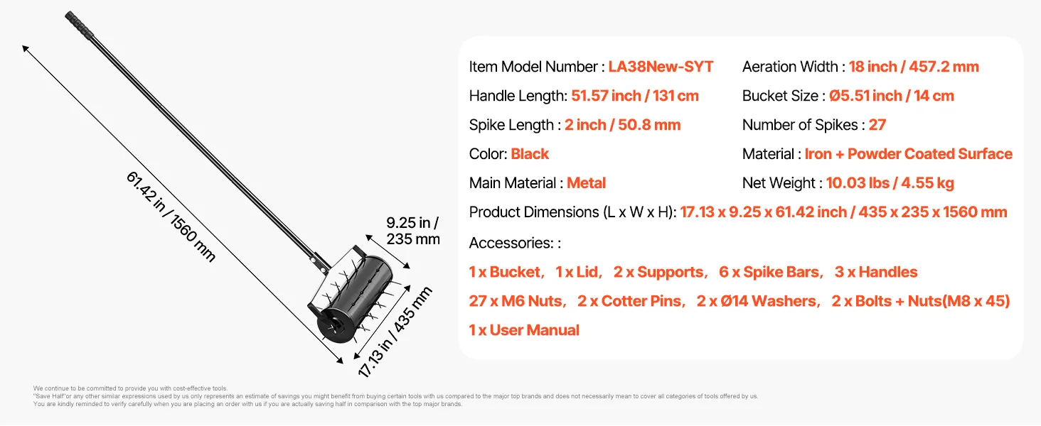 2-Inch Deep Aeration: The spikes on this manual lawn aerator are 2 inches long, with a diameter of 5.51 inches and 27 evenly distributed spikes across an 18-inch bucket. It easily penetrates sandy and grassy soils, allowing water and nutrients to reach plant roots and support healthy growth.