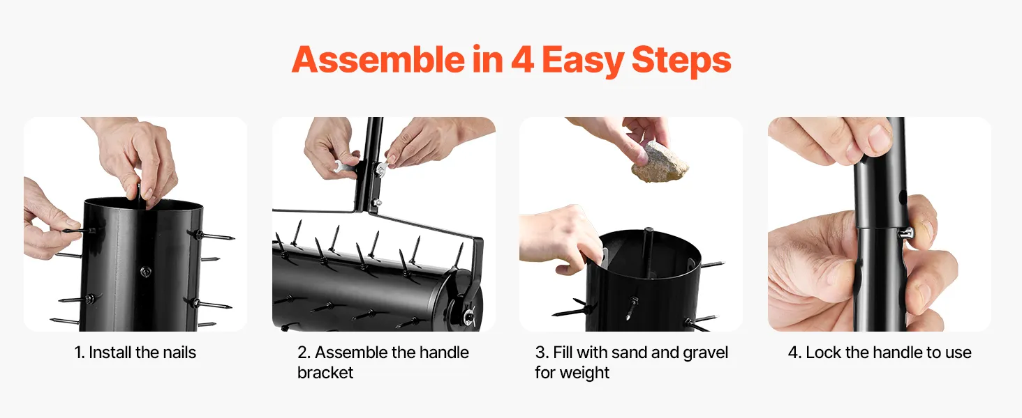 Our manual lawn aerator comes with a full set of installation tools and an instruction manual, allowing for easy assembly following the step-by-step guide.