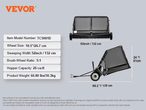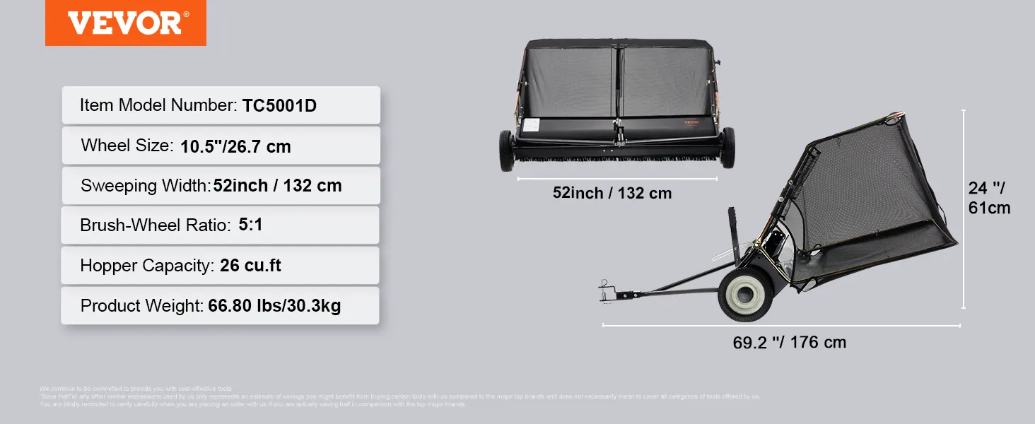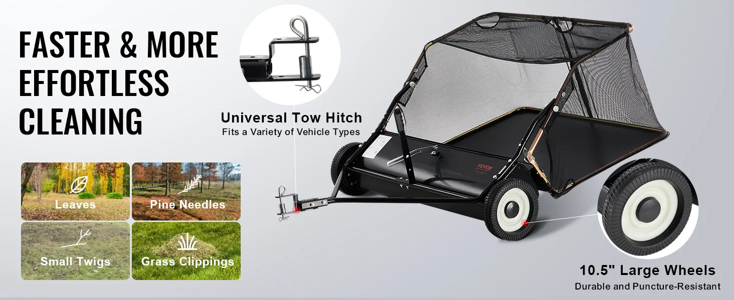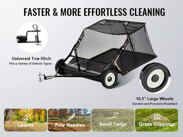 The universal hitch is compatible with a range of vehicles. The 10.5" large wheels are durable and puncture-resistant, providing smooth moving on different surfaces. The sturdy PP brushes deliver a thorough sweep. Finish the job quickly and effortlessly!