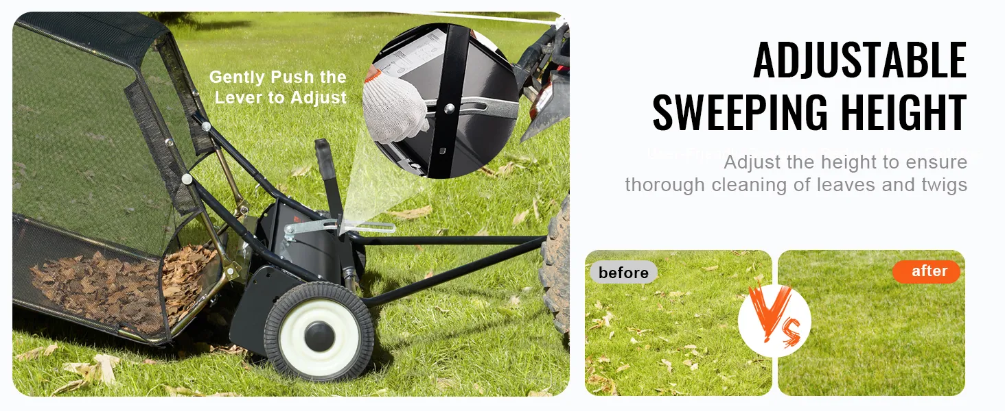 Adjustable Rotating Brush Height: Easily adjust the brush height with the lever—no special tools are required. This feature allows the lawn sweeper to adapt to various terrains, including sidewalks, driveways, yards, and lawns.