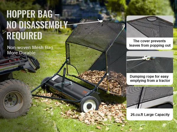 Large Capacity Collection Bag: The high-quality, non-woven fabric bag holds up to 26 cu.ft. of yard waste, allowing you to collect more grass clippings, and leaves without emptying it frequently. The cover prevents leaves from flying out, and the dump rope makes it easy to dispose of the contents directly from the tractor.