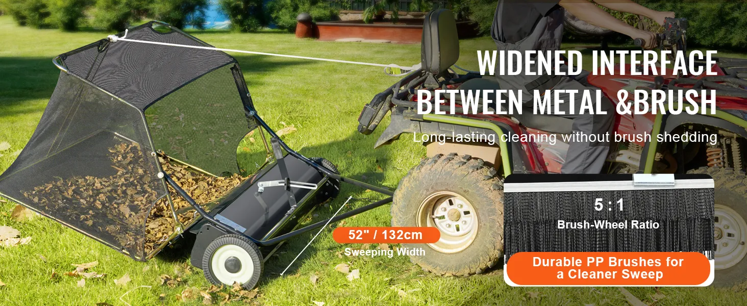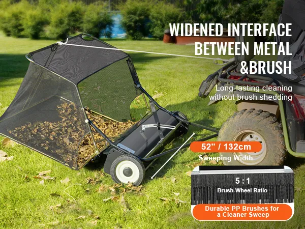 52-inch Sweeping Width: Our tow-behind lawn sweeper features a 52" sweeping width, allowing you to cover more area in one pass. Unlike many other models, it widens metal-to-brush connection at the bottom and with an 11" diameter brush for enhanced efficiency in removing leaves and grass.