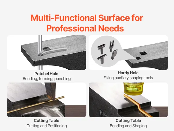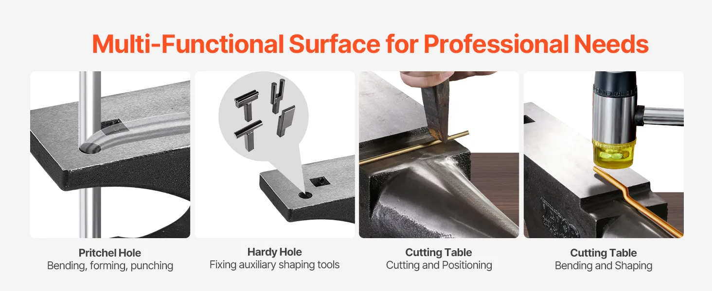 Multifunctionele gaten: het aambeeld van de smid is nauwkeurig vervaardigd en heeft gladdere en fijnere functionele gaten. Het Pritchel-gat is ideaal voor buigen en vormen, terwijl het Hardy-gat ideaal is voor accessoires, ponsen en buigen. Hij kan op uw werkbank worden geklemd of geschroefd, zodat hij tijdens gebruik stil blijft staan en uitstekende prestaties garandeert.