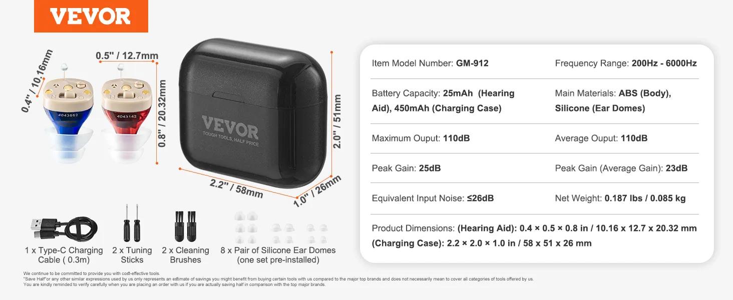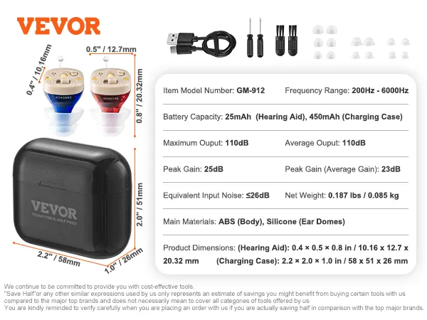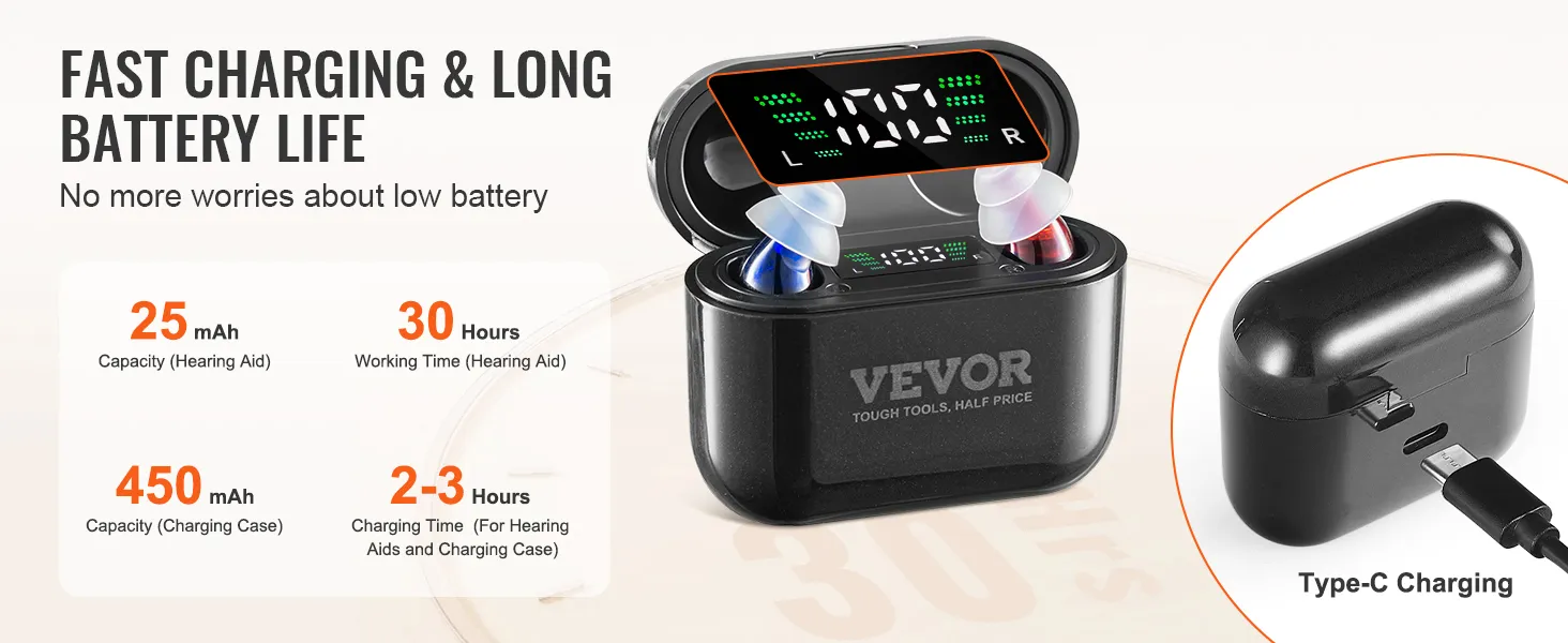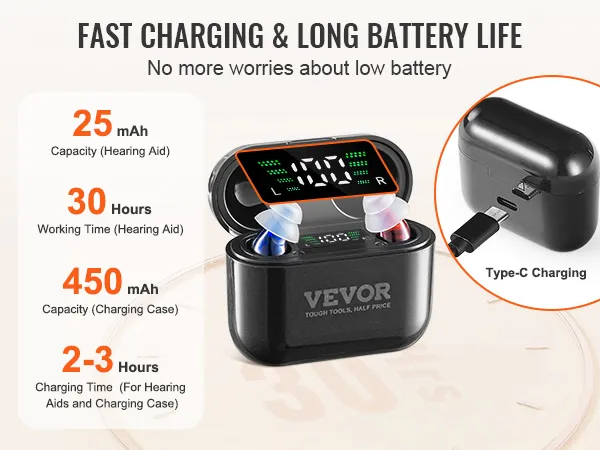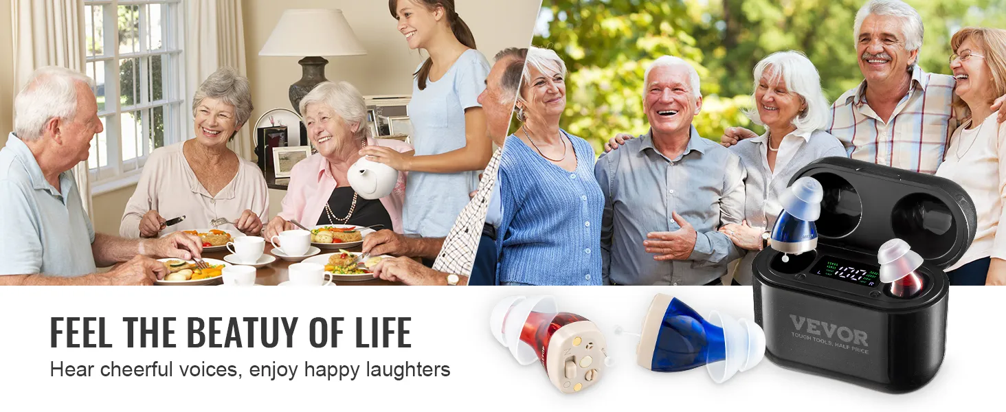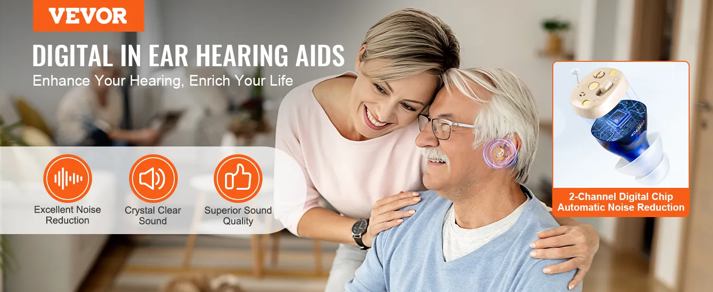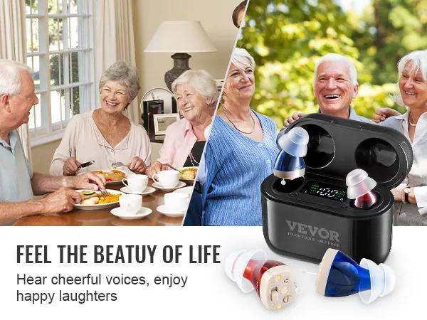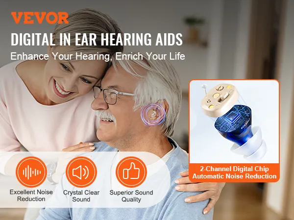 Upgraded Digital Chip: Equipped with 2-channel digital chip and automatic noise reduction, VEVOR hearing aids effectively minimize background noise while amplifying speech. Experience detailed, natural sound and rediscover the joy of clear hearing