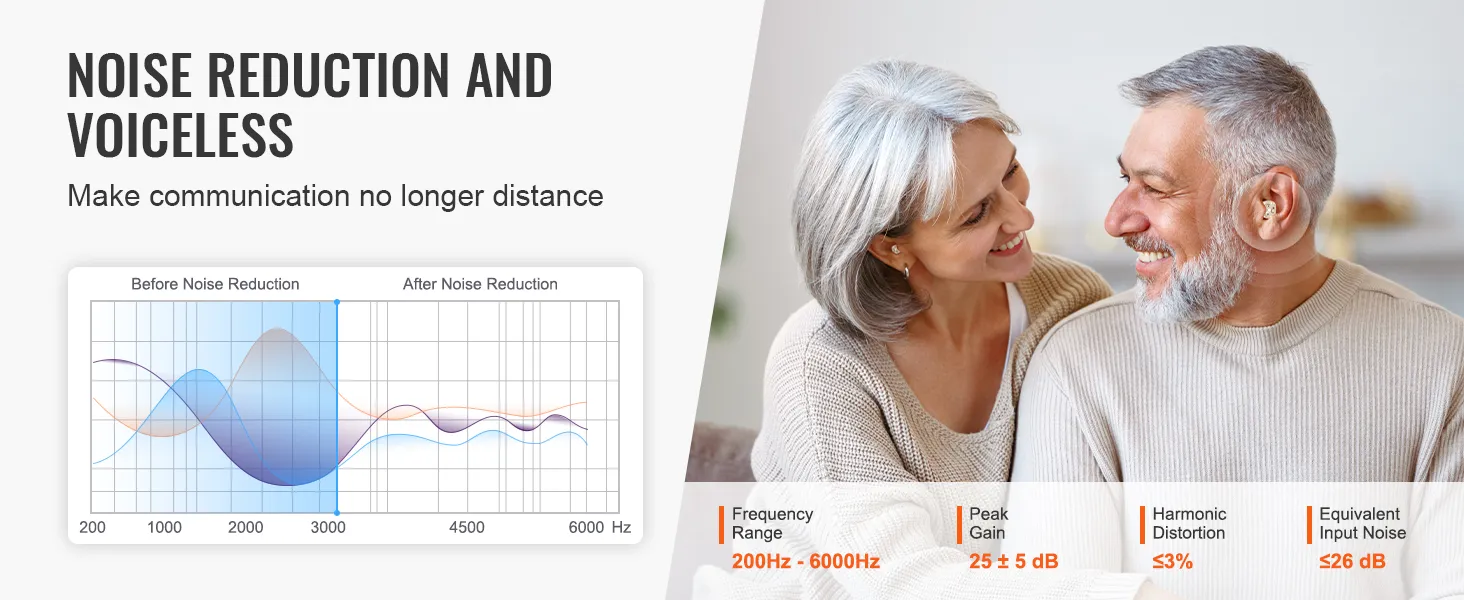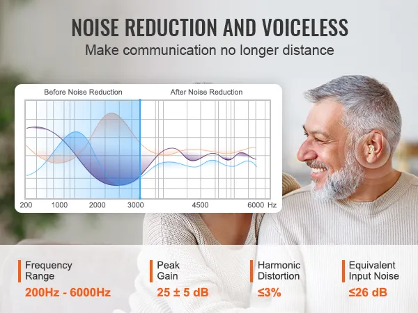 With a frequency response range of 200Hz to 6000Hz, a peak gain of 25dB, and harmonic distortion ≤3%, our hearing aids hearing amplifiers deliver exceptional noise reduction and enhanced speech clarity. Your trusted companion for clearer hearing!