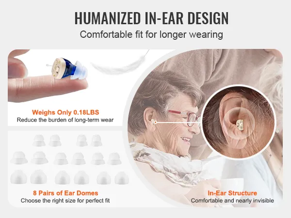 The in-ear design is both discreet and comfortable, fitting snugly in the ear canal. Comes with 8 pairs of silicone ear domes to fit different ear canal shapes and sizes, our hearing assist device allows for extended wear without discomfort.