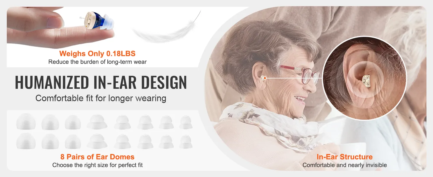 Ideal Gift Choice: Our digital hearing aids come with 8 pairs of silicone ear domes to fit different ear canal sizes. Designed for those with mild to moderate hearing loss, they help users hear clearly, allowing them to return to normal lives