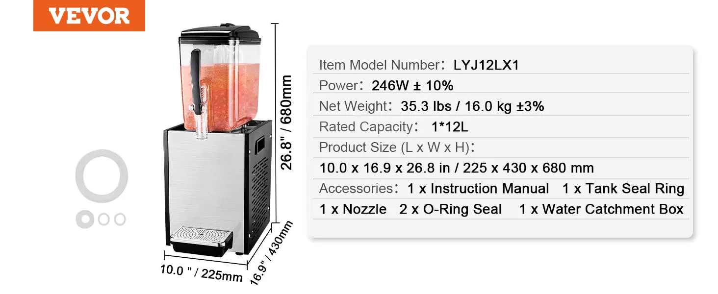Large Capacity: This commercial beverage dispenser has a tank capacity of 12 L, accommodating a large volume of beverages. It features an upgraded wide diameter dispensing spout, allowing smooth and easy dispensing of drinks with small particles such as coconut juice and fruit pulp. Equipped with a rubber sealing ring to prevent beverage leakage.