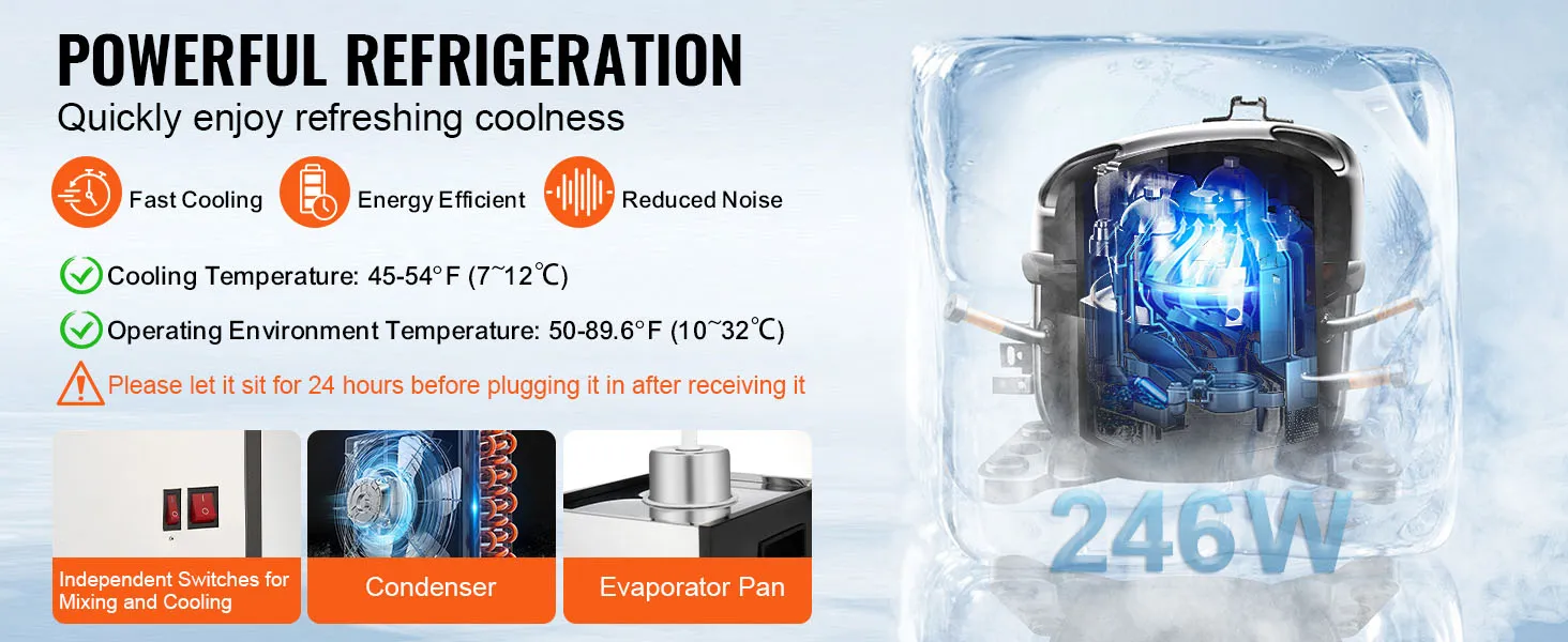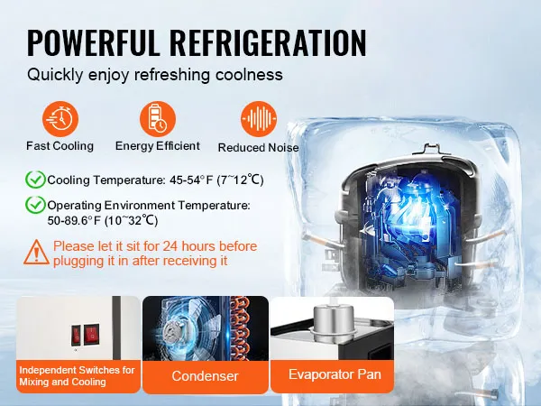 Efficient Temperature Control: The compressor and condenser components ensure rapid cooling and high efficiency. The large-area 304 food-grade stainless steel evaporator speeds up cooling, while the stirring rod ensures thorough mixing for uniform beverage temperature. It maintains the beverage temperature within a comfortable range of 45-54°F (7-12°C). Simple button switches facilitate easy setting of cooling and stirring functions.