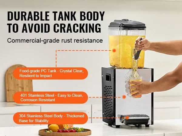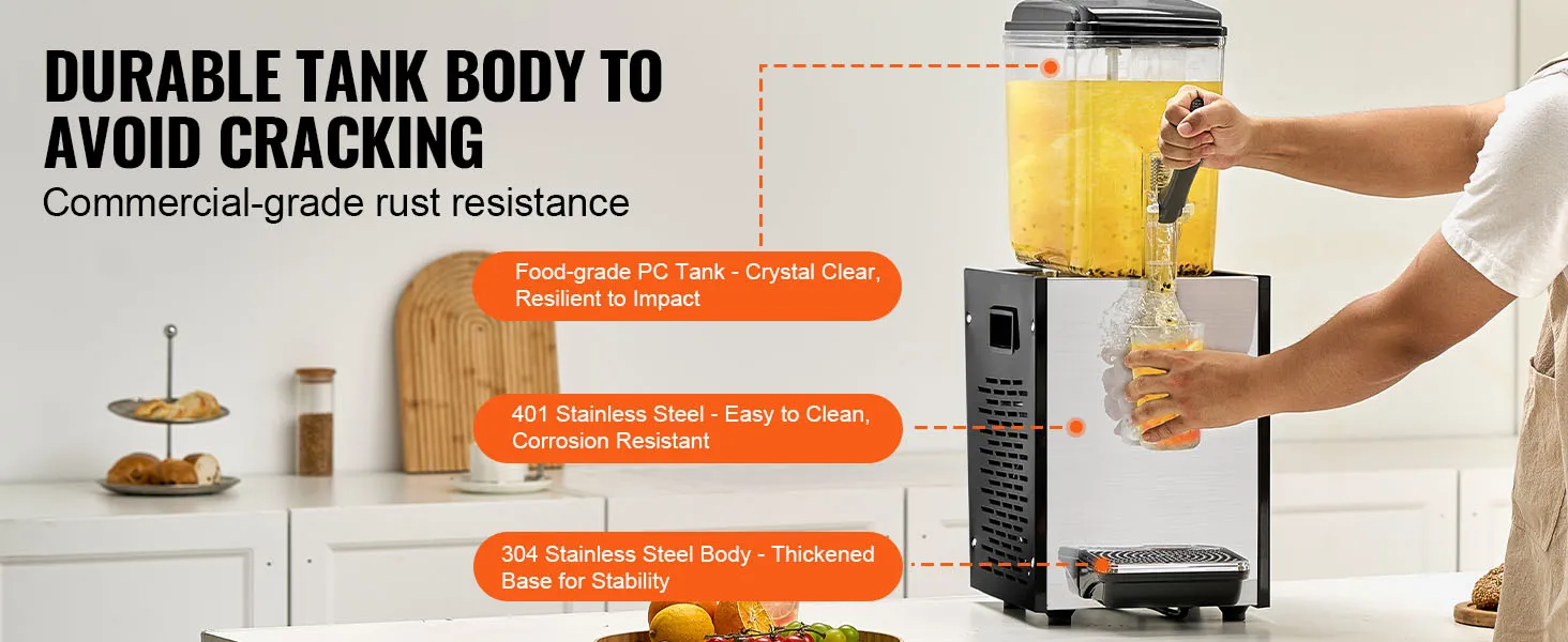 This large-scale beverage dispenser is made of food-grade materials, durable and resistant to high temperatures, ensuring beverage quality and preserving the original taste during production, providing you with a great taste experience.