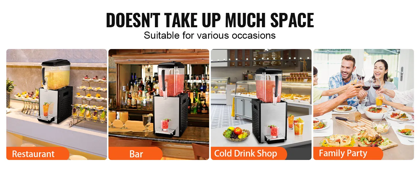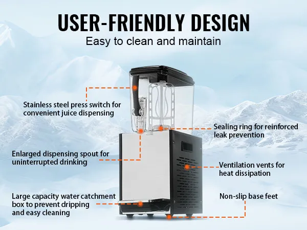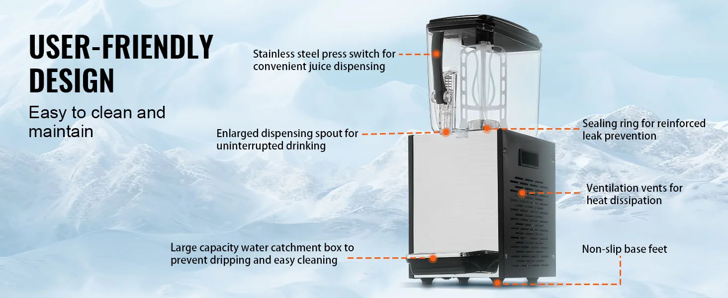 User-Friendly Design: Features a stainless steel press switch for convenient juice dispensing and an enlarged dispensing spout for uninterrupted drinking. It can be operated with one hand. The bottom has a large capacity water receiving tray to prevent beverage dripping, eliminating the need for frequent water pouring. Enhanced radiator and anti-slip base ensure safety.
