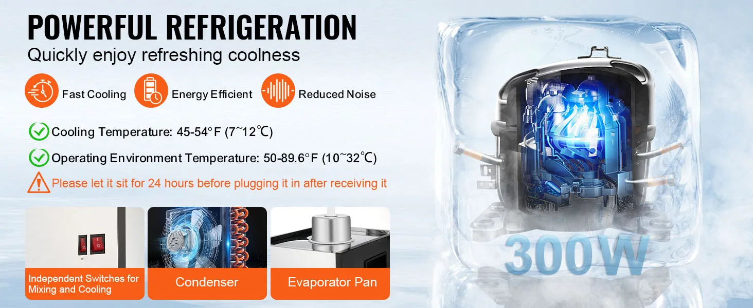 Efficient Temperature Control: The compressor and condenser components ensure rapid cooling and high efficiency. The large-area 304 food-grade stainless steel evaporator speeds up cooling, while the stirring rod ensures thorough mixing for uniform beverage temperature. It maintains the beverage temperature within a comfortable range of 45-54°F (7-12°C). Simple button switches facilitate easy setting of cooling and stirring functions.