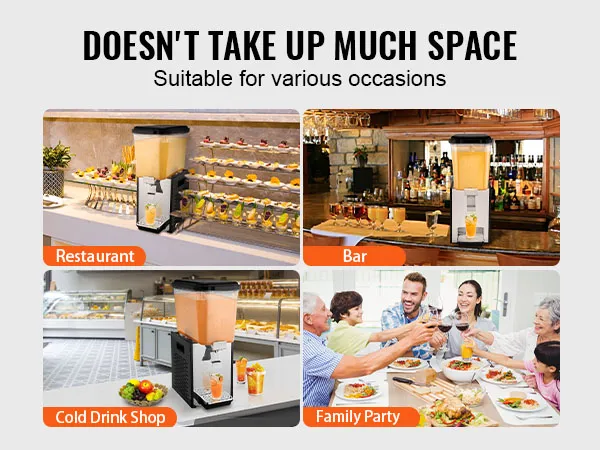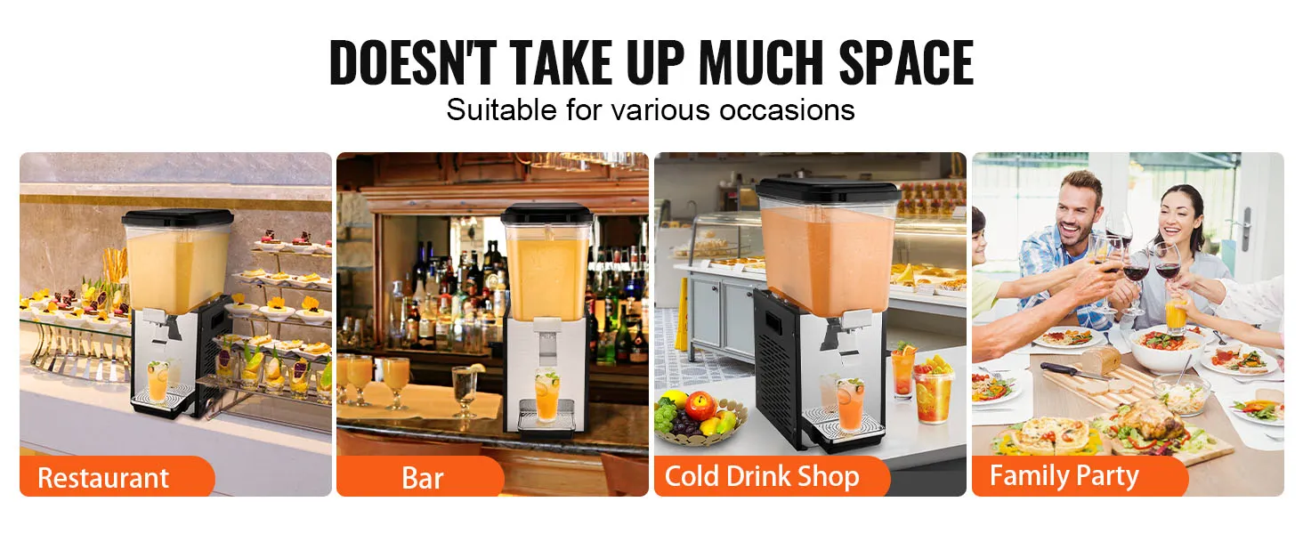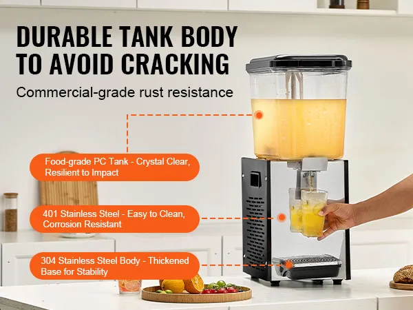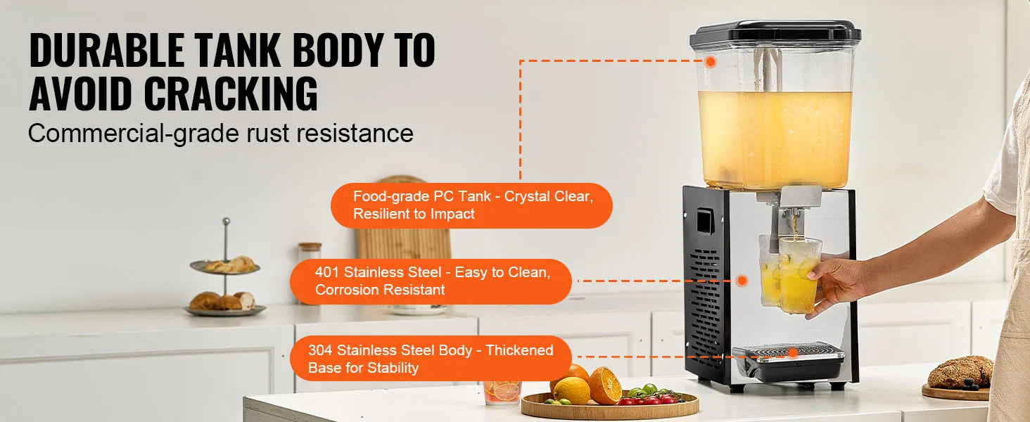 Large Capacity: This commercial beverage dispenser features a 18L tank capacity, accommodating a large volume of beverages. It provides a reliable cold beverage experience and easily handles customer traffic. Equipped with a rubber sealing ring to prevent beverage leakage.