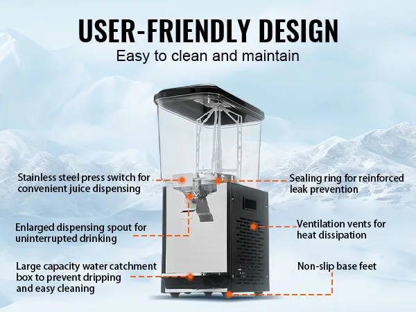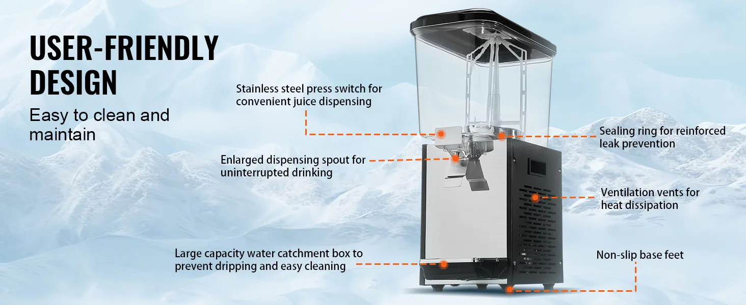 User-Friendly Design: Features a stainless steel press switch for convenient juice dispensing and an enlarged dispensing spout for uninterrupted drinking. It can be operated with one hand. The bottom has a large capacity water receiving tray to prevent beverage dripping, eliminating the need for frequent water pouring. Enhanced radiator and anti-slip base ensure safety.