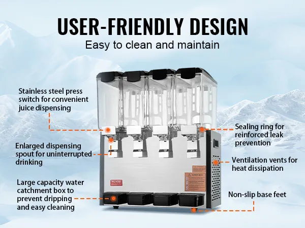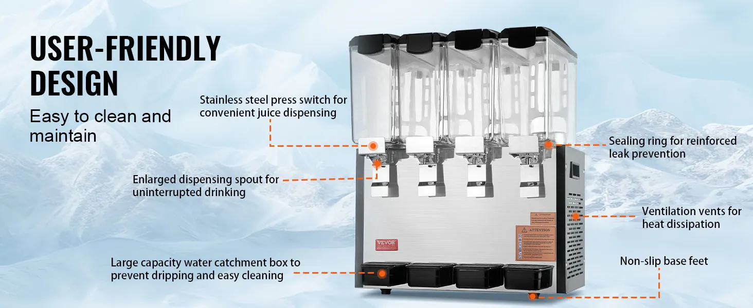 Gebruiksvriendelijk ontwerp: Uitgerust met een roestvrijstalen drukknop voor gemakkelijke sapuitgifte en een vergrote tuit voor ononderbroken drinken. Kan met één hand worden bediend. Een grote wateropvangbak aan de onderkant voorkomt dat de drank druppelt en maakt veelvuldig bijvullen overbodig. Een verbeterde koeler en een antislipbasis zorgen voor veiligheid.