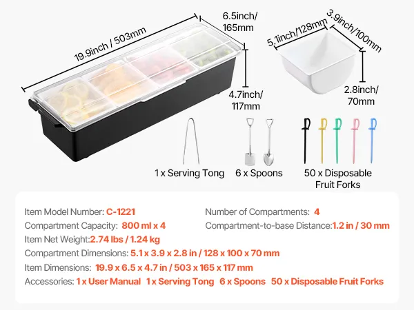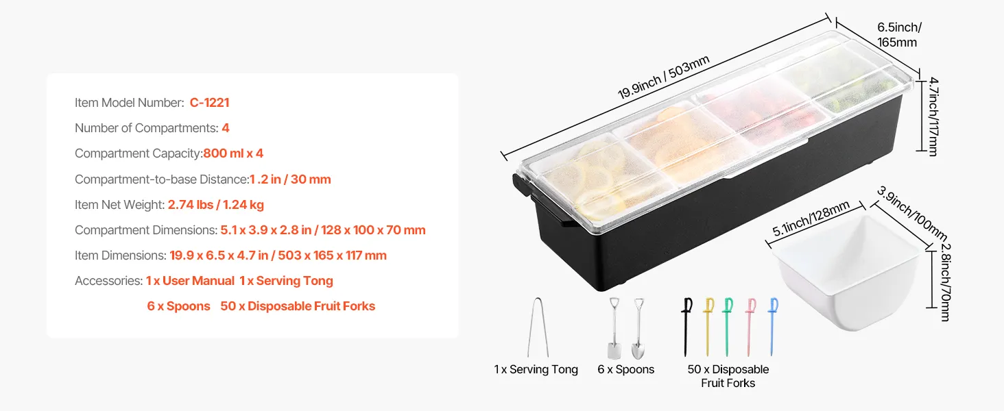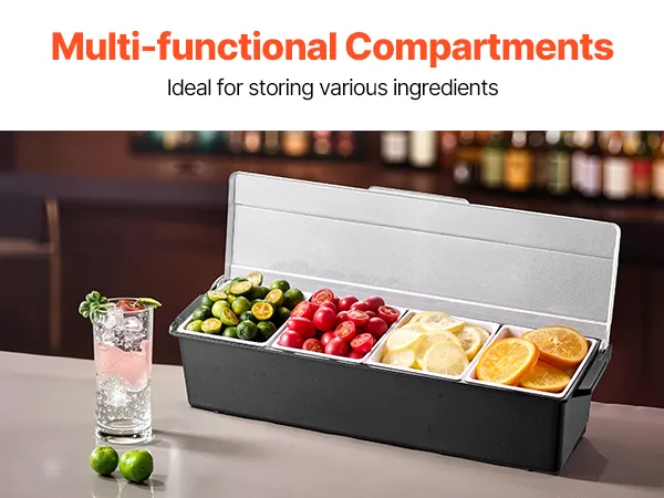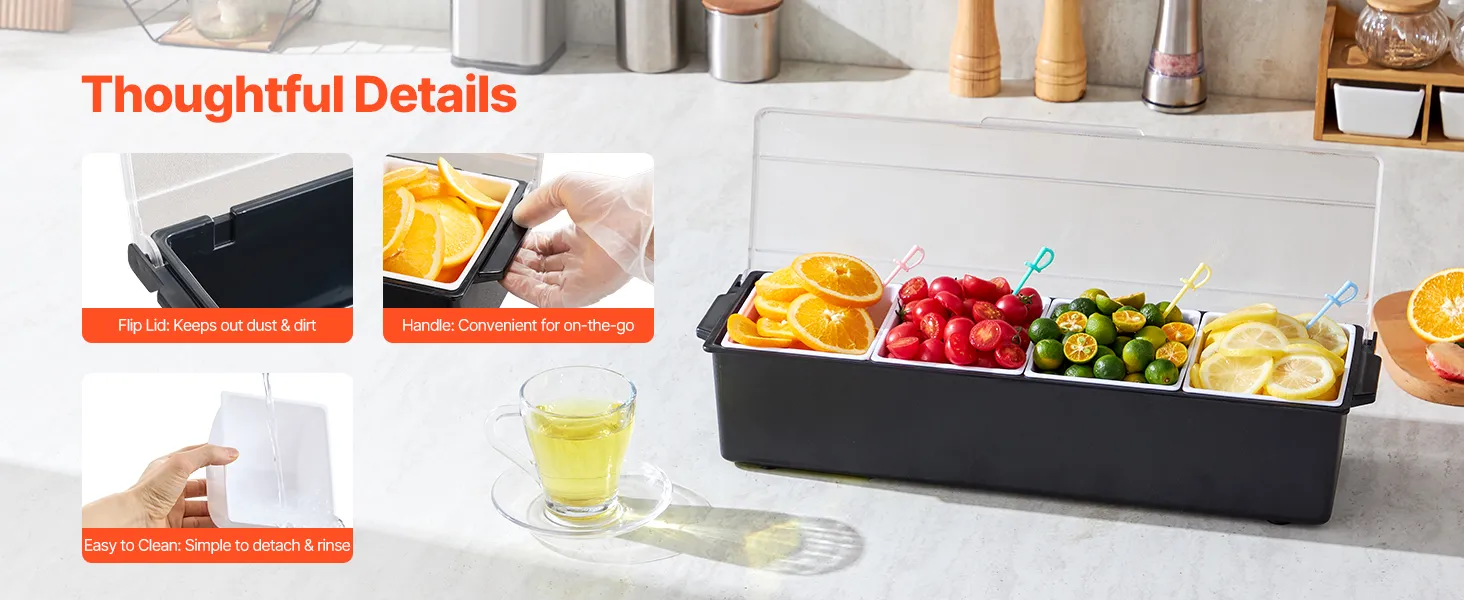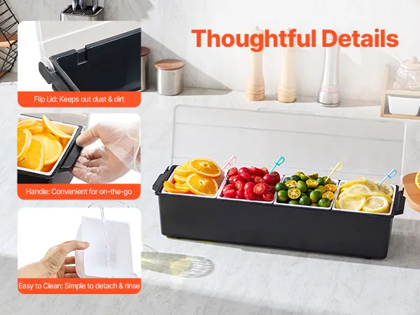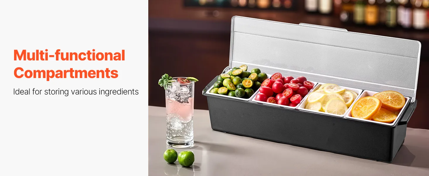 4 Detachable Compartments: Our bar fruit caddy with lid features 4 spacious compartments that can be adjusted as needed, making it easy to store different ingredients like lemon slices and cherries without mixing flavors