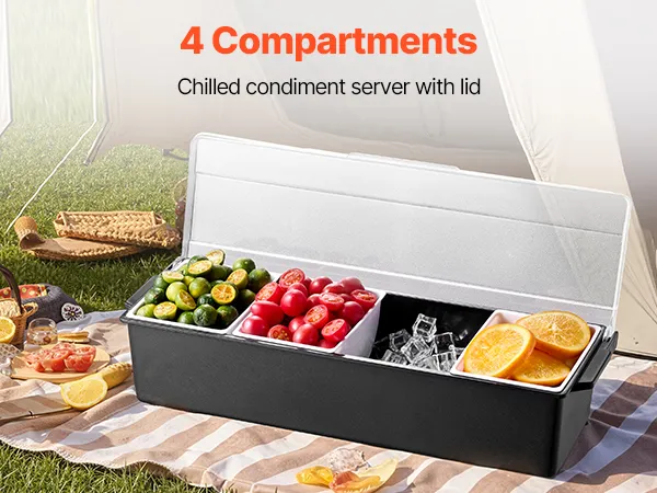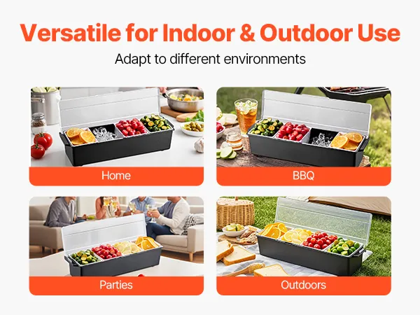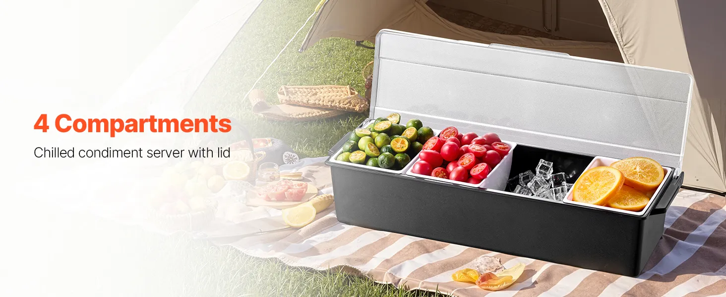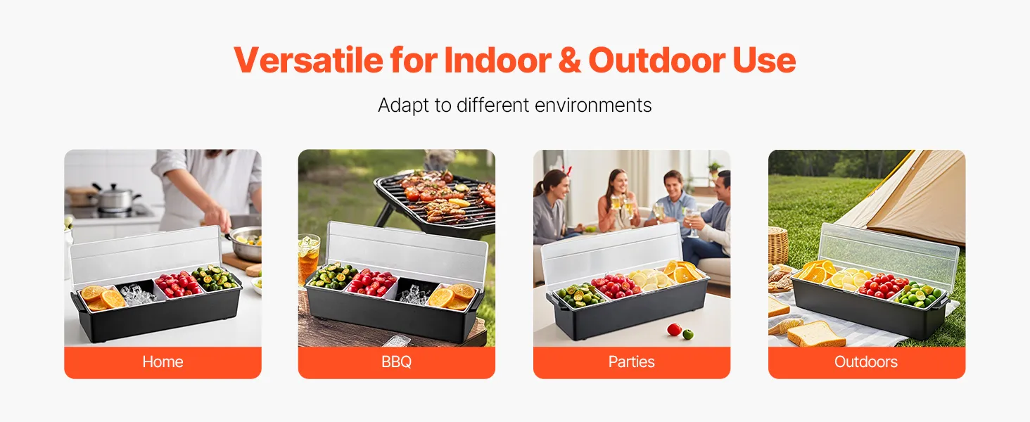 Designed to fit seamlessly into both indoor and outdoor environments, our ice cooled condiment holder is ideal for bartending at the bar, hosting family gatherings, organizing company events, or enjoying outdoor activities like camping and BBQs, all while maintaining food freshness & presentation.