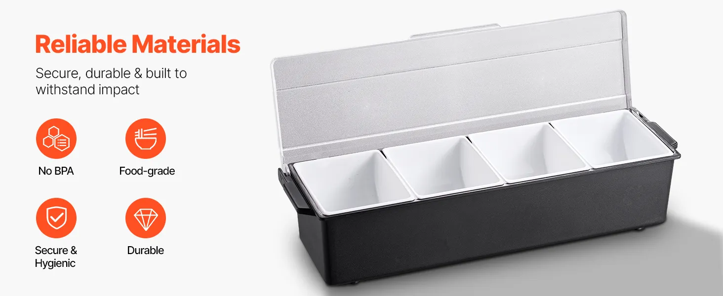 Easy to Clean: Both the food containers and outer casing of our bar condiment tray with lid are easy to disassemble, allowing for quick and thorough cleaning after each use for easy maintenance