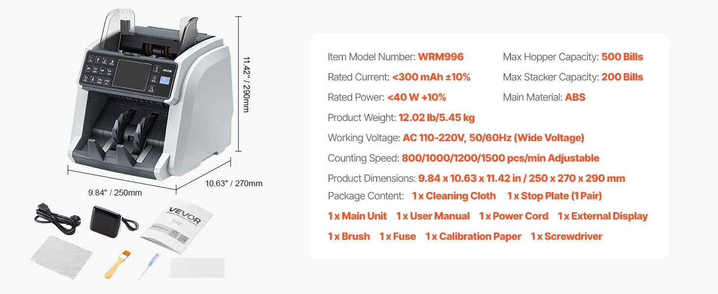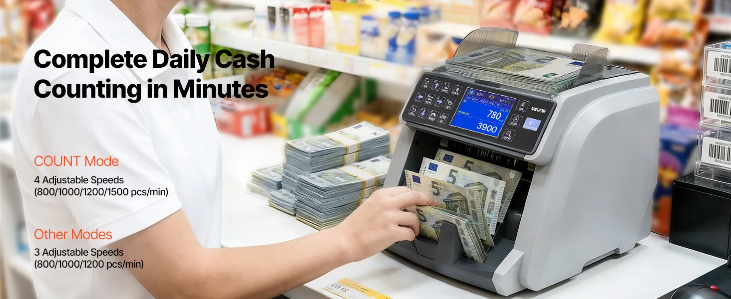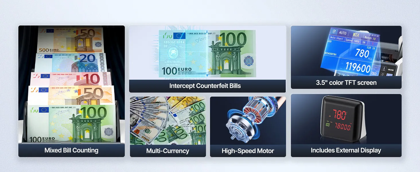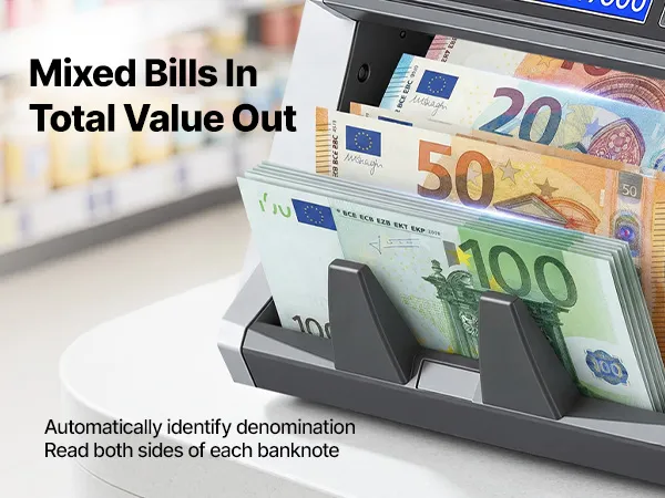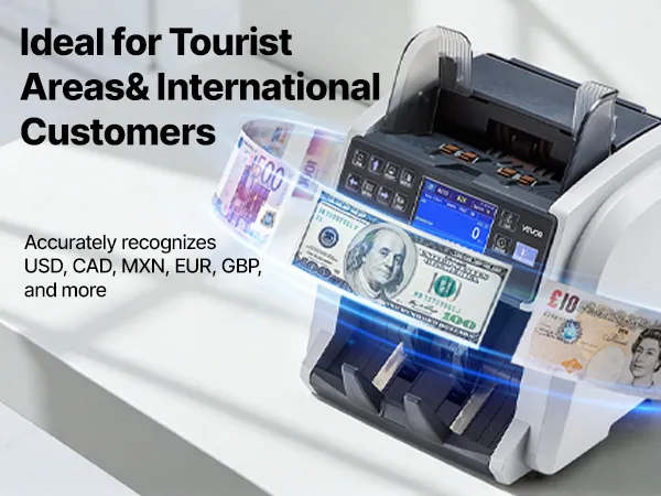 Verwerkt meerdere valuta: De bankbiljettensteller ondersteunt het tellen en herkennen van gangbare valuta zoals USD, CAD, MXN, EUR en GBP. Gemengde valuta kunnen worden geteld zonder handmatige scheiding, waardoor één apparaat voldoende is voor bedrijven met frequente internationale contante transacties.
