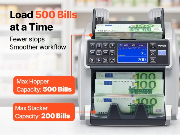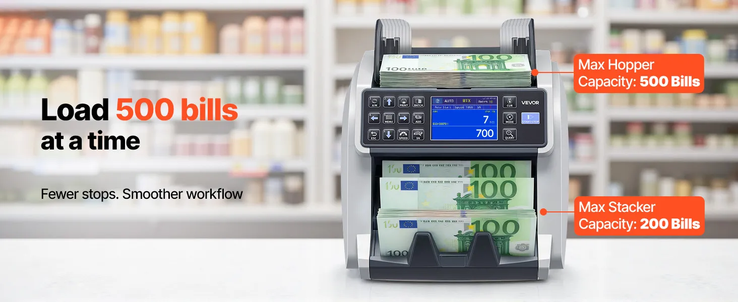 Efficiënt tijdens piekuren: De invoerlade heeft een capaciteit van maximaal 500 bankbiljetten en de stapelaar stopt bij 200. Dankzij vier instelbare snelheden (800/1000/1200/1500 bankbiljetten/min) is de dagelijkse kascontrole in slechts enkele minuten voltooid. Deze geldtelmachine is ideaal voor de dagafsluiting, nachtcontroles en werkzaamheden in het weekend.