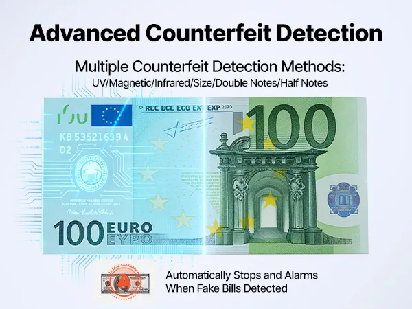 Verminder verliezen door vals geld: Deze geldtelmachine met geïntegreerde UV-, MG-, IR-, DD-, DBL-, HLF- en CHN-detectie herkent valse bankbiljetten, halve biljetten en aan elkaar gekoppelde biljetten. Bij detectie van verdacht geld stopt de machine onmiddellijk en gaat er een alarm af.