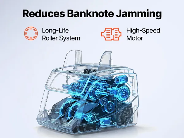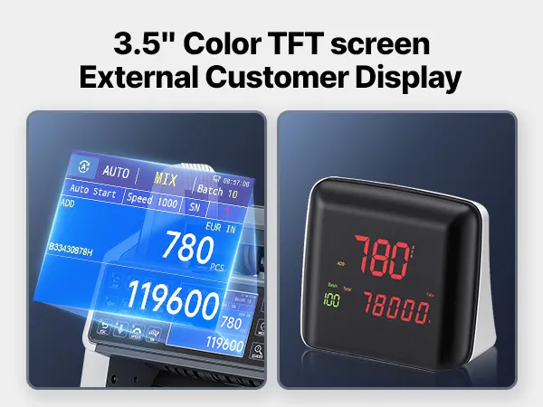 Dubbel displaysysteem: De geldtelmachine is voorzien van een 3,5-inch kleuren-TFT-display voor een duidelijke weergave van het aantal en de waarde van de bankbiljetten, evenals een extern standaard klantendisplay voor gelijktijdige weergave. Een robuust aandrijfsysteem garandeert een lange gebruiksduur met minimaal onderhoud.