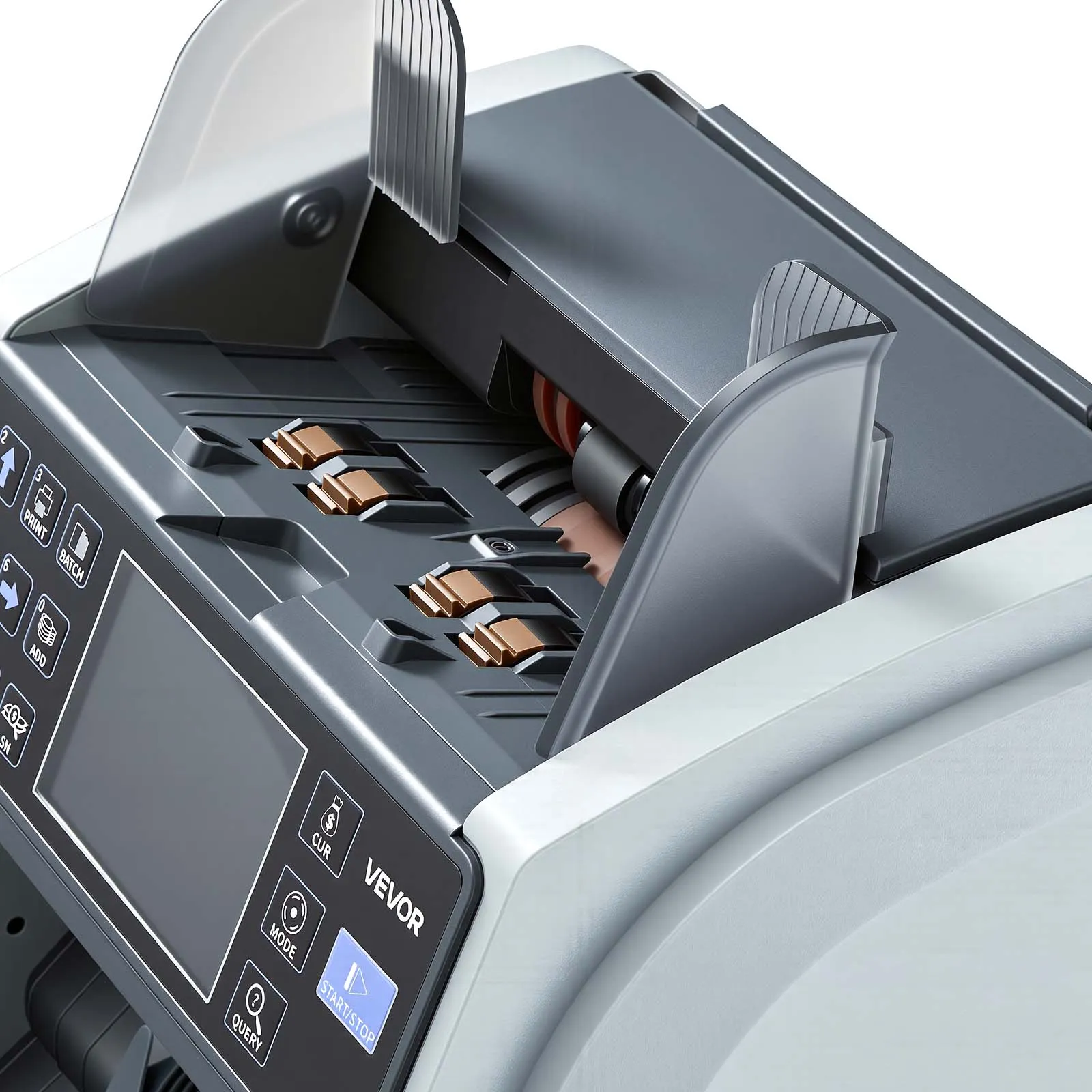 UV, MG, IR, DD, automatische detectie van halve, meervoudige en dubbele bankbiljetten. Twee CIS-beeldsensoren voor herkenning van de waarde, ondersteunt gemengde telling. Herkent meerdere valuta, waaronder USD, CAD, MXN, EUR en GBP.