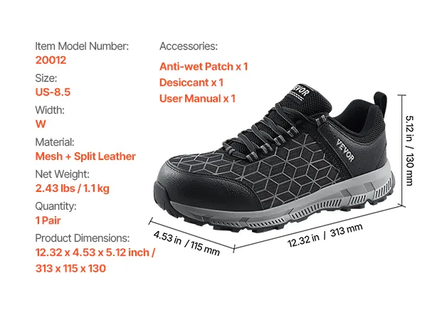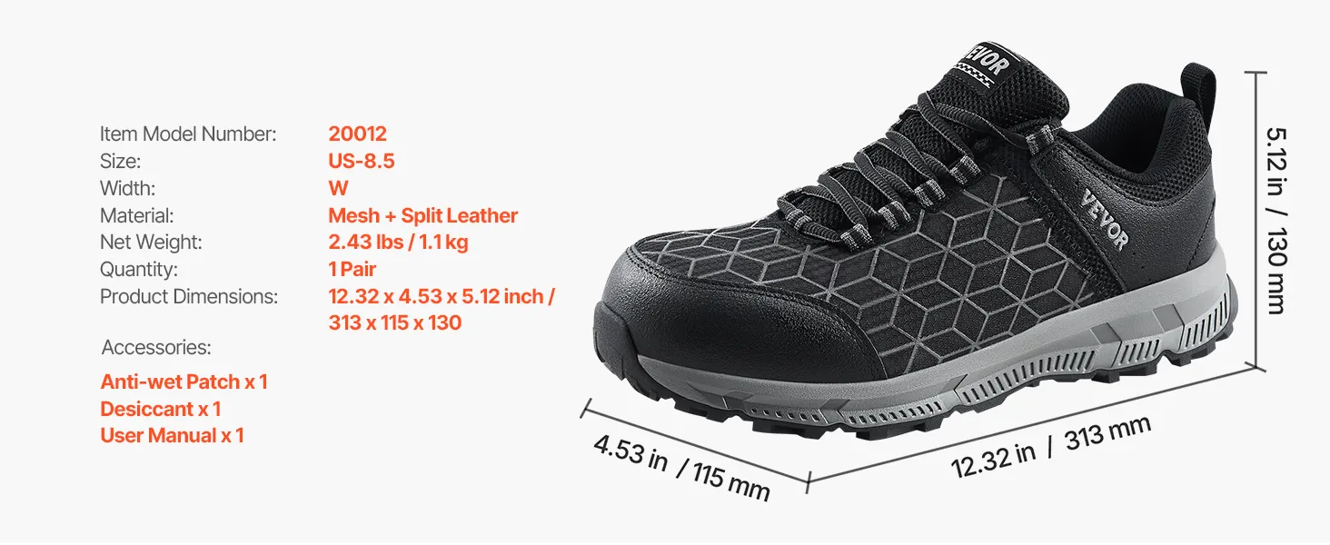 Maatselectie: We bieden maten van 8 tot 13, met zowel M- als W-breedtes beschikbaar. U kunt eenvoudig de juiste maat kiezen op basis van uw voetlengte en -breedte, zodat u de hele dag een comfortabele en veilige pasvorm kunt garanderen.