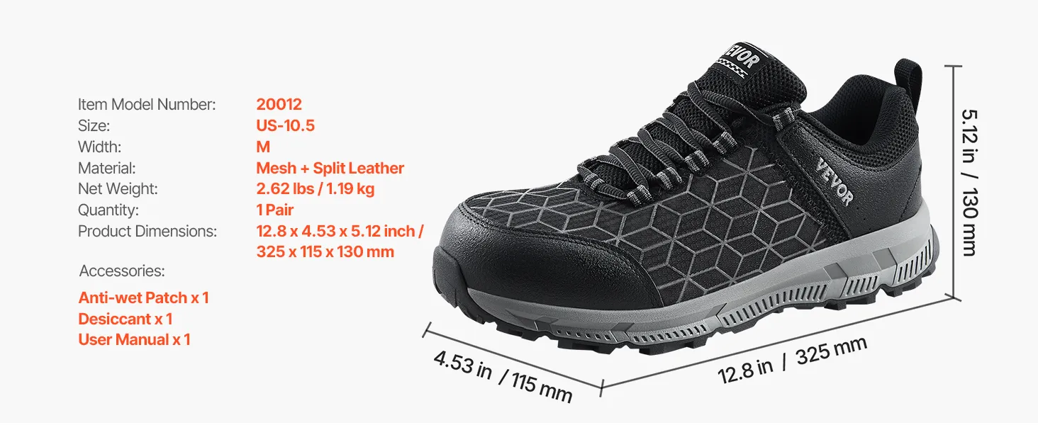 Maatselectie: We bieden maten van 8 tot 13, met zowel M- als W-breedtes beschikbaar. U kunt eenvoudig de juiste maat kiezen op basis van uw voetlengte en -breedte, zodat u de hele dag een comfortabele en veilige pasvorm kunt garanderen.