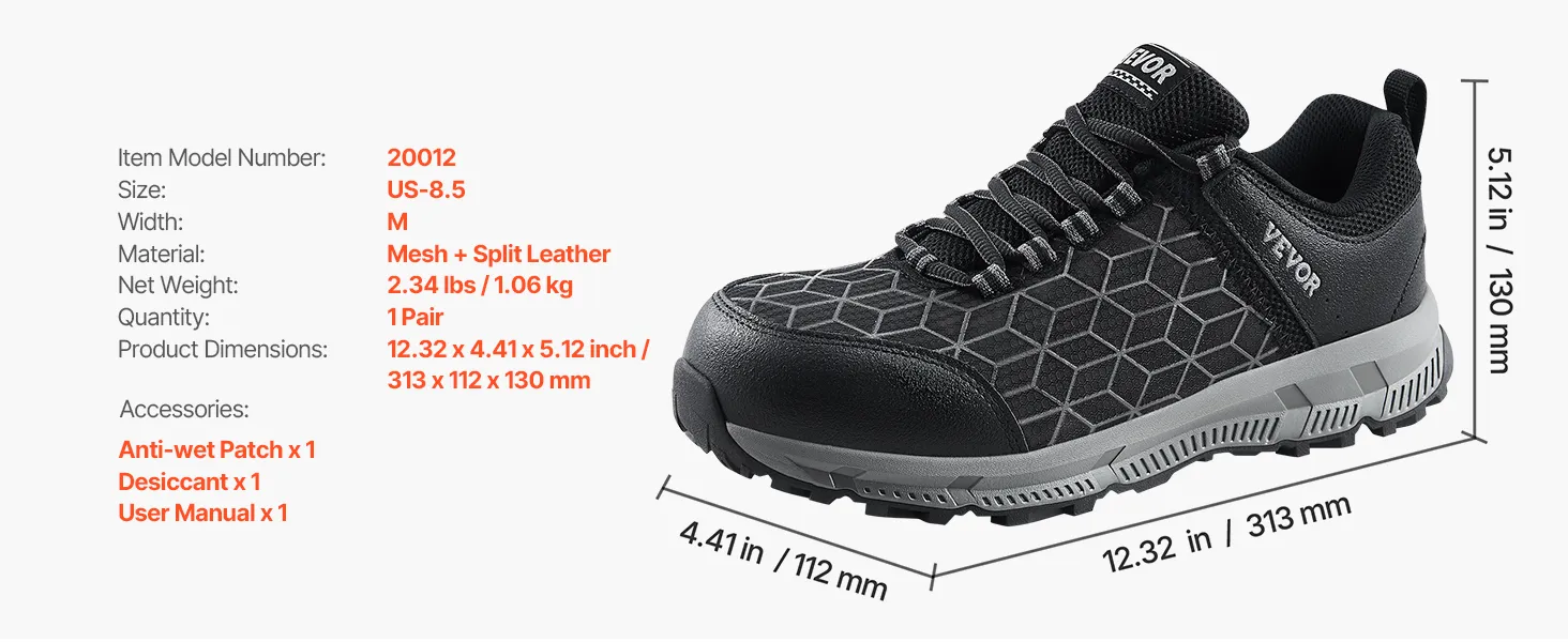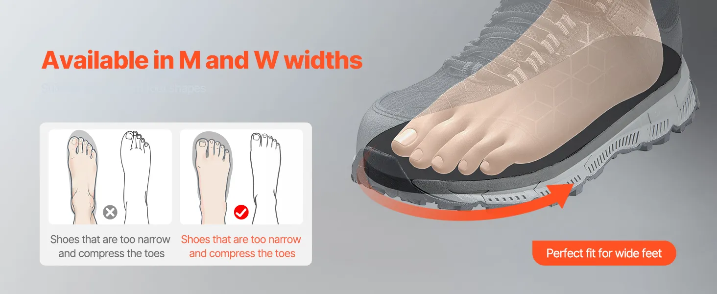 Maatselectie: We bieden maten van 8 tot 13, met zowel M- als W-breedtes beschikbaar. U kunt eenvoudig de juiste maat kiezen op basis van uw voetlengte en -breedte, zodat u de hele dag een comfortabele en veilige pasvorm kunt garanderen.