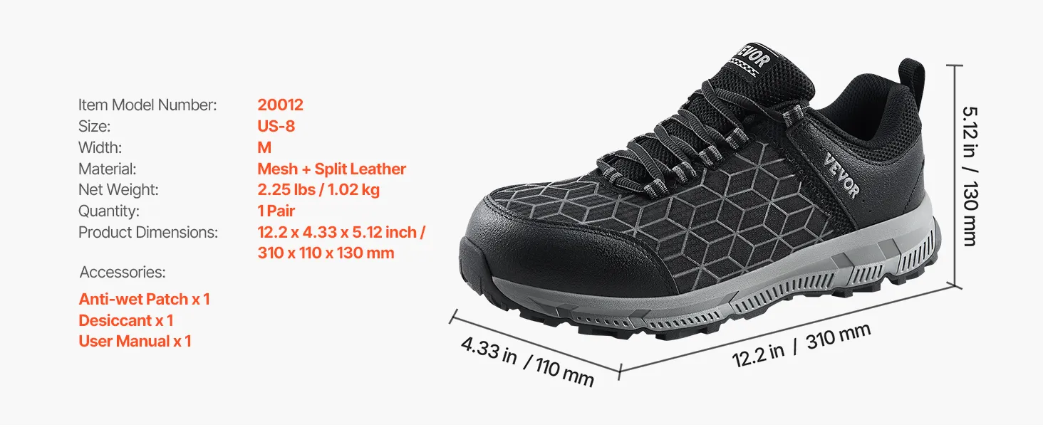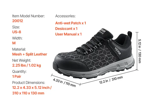 Maatselectie: We bieden maten van 8 tot 13, met zowel M- als W-breedtes beschikbaar. U kunt eenvoudig de juiste maat kiezen op basis van uw voetlengte en -breedte, zodat u de hele dag een comfortabele en veilige pasvorm kunt garanderen.