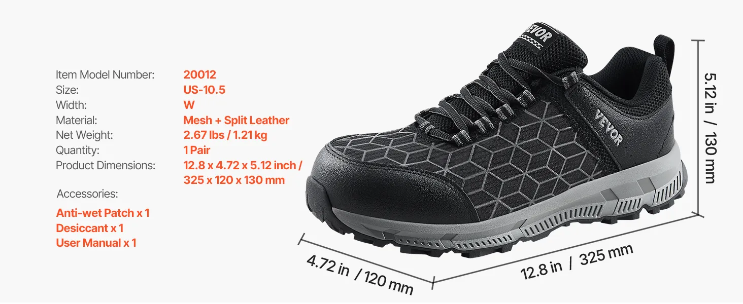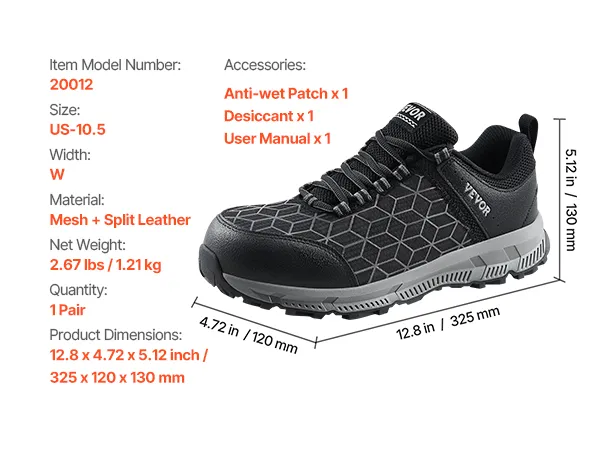 VEVOR Veiligheidsschoenen voor heren, EU-maat 44 breed, werkschoenen met gevoerde neus, onverwoestbare veiligheidssneakers, ademende schoenen voor industrie en bouw, zwart