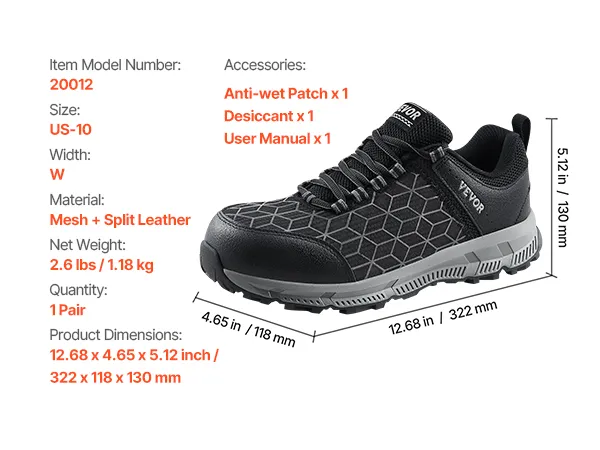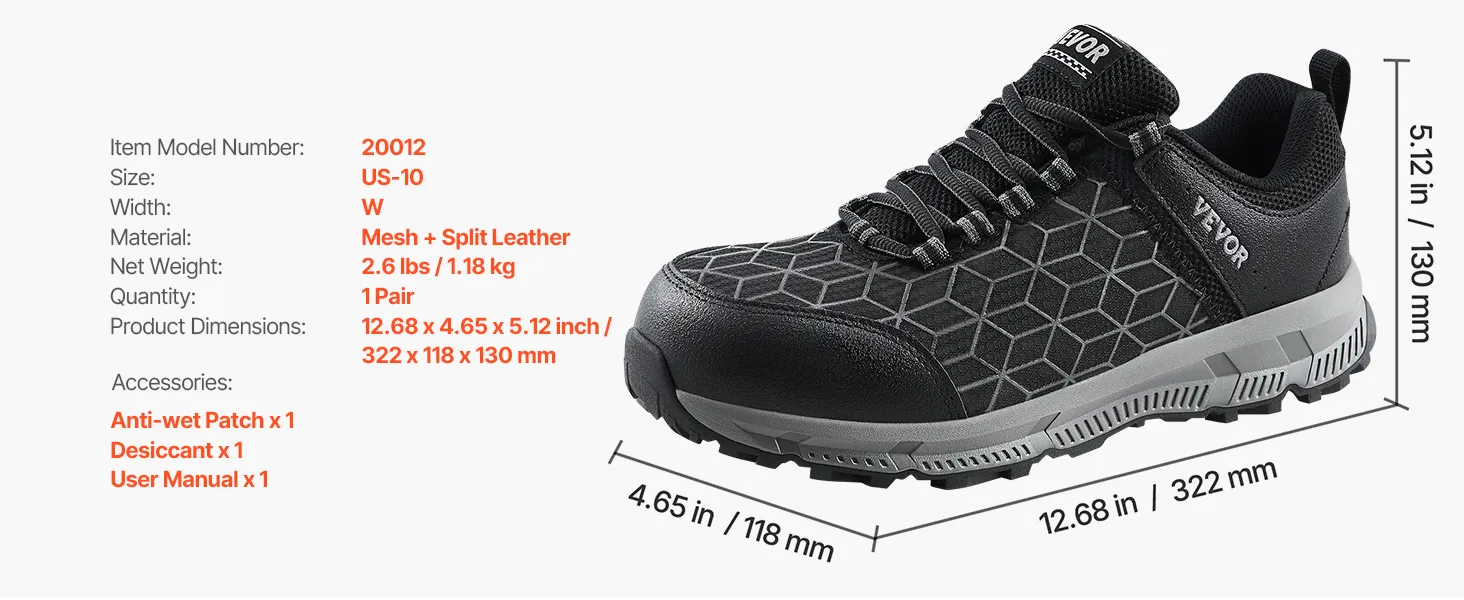Maatselectie: We bieden maten van 8 tot 13, met zowel M- als W-breedtes beschikbaar. U kunt eenvoudig de juiste maat kiezen op basis van uw voetlengte en -breedte, zodat u de hele dag een comfortabele en veilige pasvorm kunt garanderen.