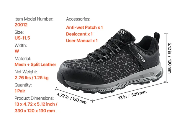 VEVOR Veiligheidsschoenen voor heren, EU-maat 45,5 breed, werkschoenen met gevoerde neus, veiligheidssneakers, lichtgewicht werkschoenen voor industrie en bouw, zwart