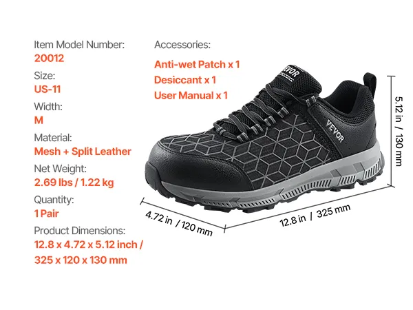 VEVOR Veiligheidsschoenen voor heren, maat 45, werkschoenen met gevoerde neus, sneakers, onverwoestbare veiligheidssneakers, lichtgewicht schoenen voor industrie en bouw, zwart