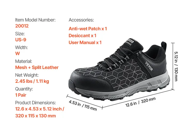 VEVOR Veiligheidsschoenen voor heren, EU-maat 42 breed, werkschoenen met gevoerde neus, onverwoestbare veiligheidssneakers, ademende schoenen voor industrie en bouw, zwart