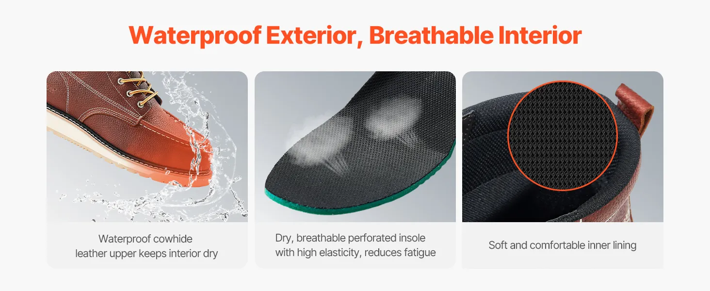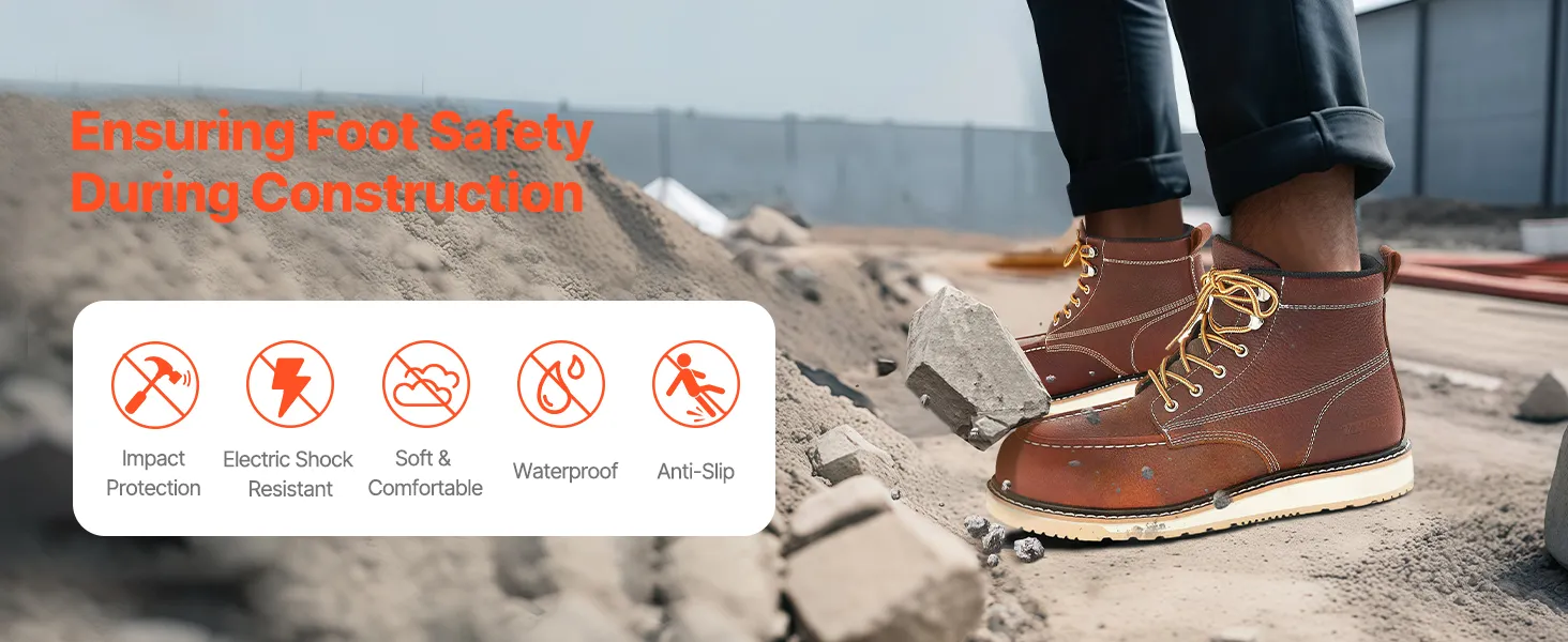 Breathable & Lightweight: These boots feature waterproof leather to keep dryness out while the breathable insoles avoid foot sweat. The soft rubber sole enhances comfort, making them ideal for workers who need to stand or walk for extended periods on construction sites.