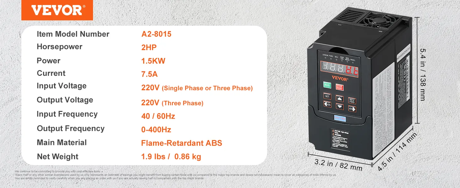 VEVOR VFD 2HP, 1.5KW, 7.5A, 1 or 3 Phase 220V Input to 3 Phase 220V Output Variable Frequency Drive, 40-60Hz Input, 0-400Hz Output VFD for Spindle Motor CNC Speed Control