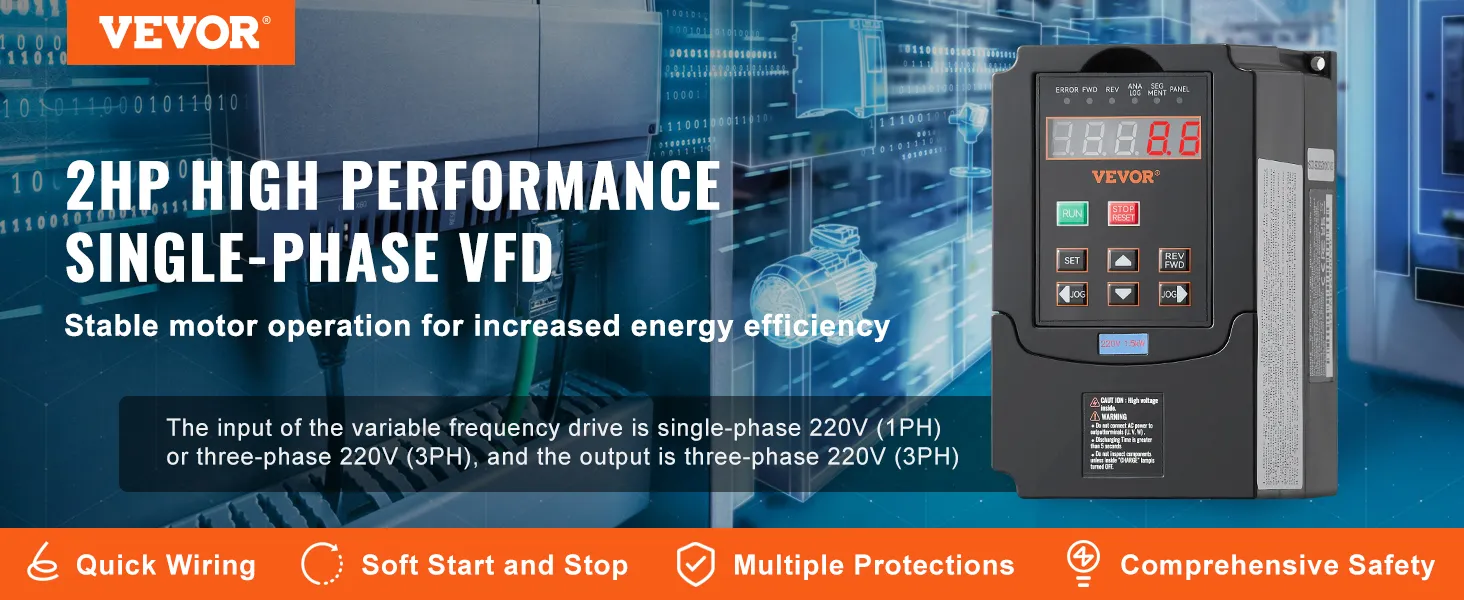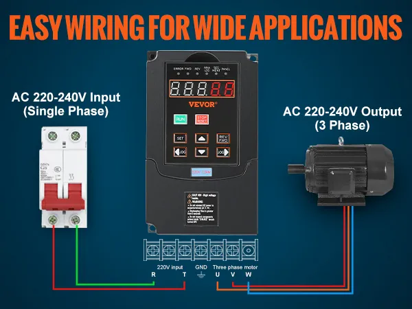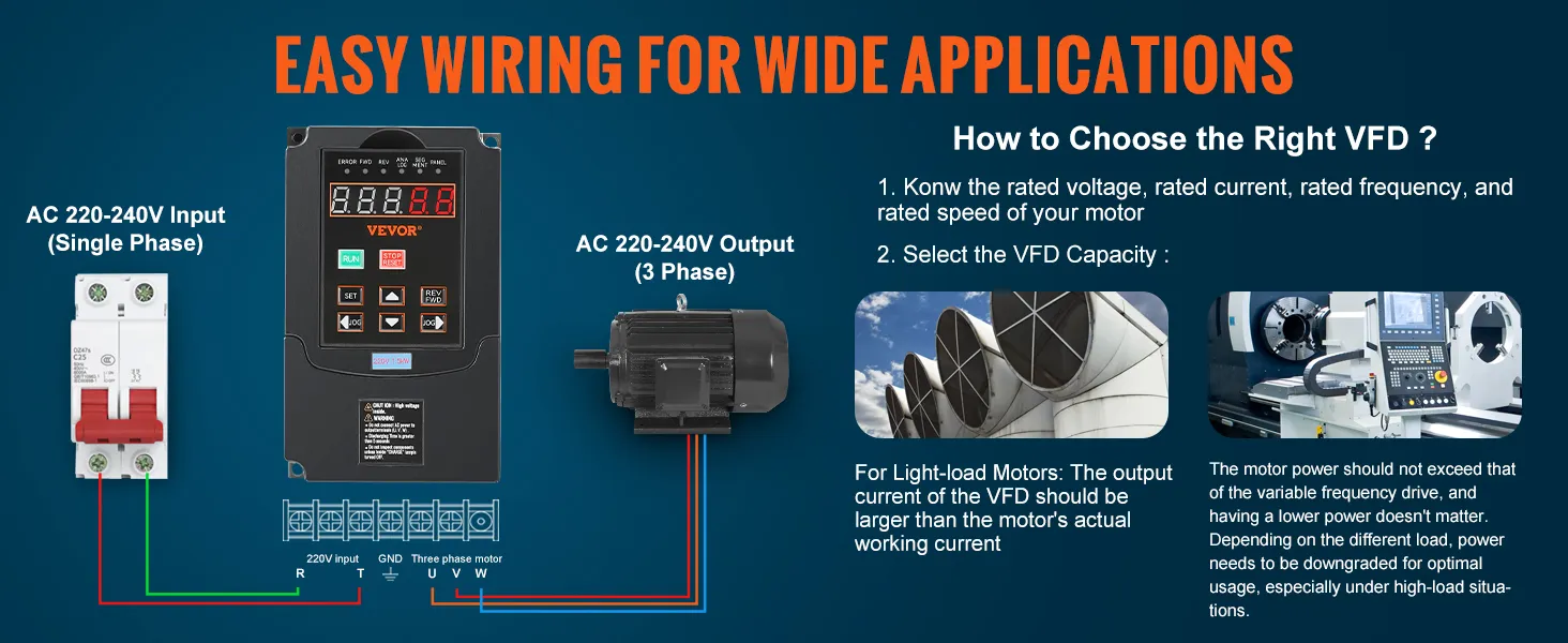 Master of Versatility: Our VFD is ideal for driving three-phase motors in diverse machinery, including CNC routers, CNC machines, milling machines, drilling machines, compressors, pumps, grinders, elevators, centrifuges, and other speed control machines. For heavier motor loads, please choose a higher-powered VFD for best results.