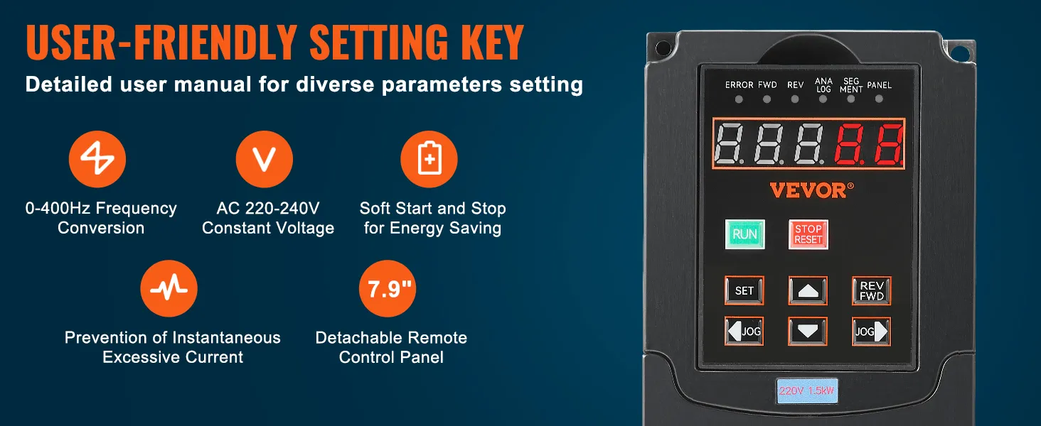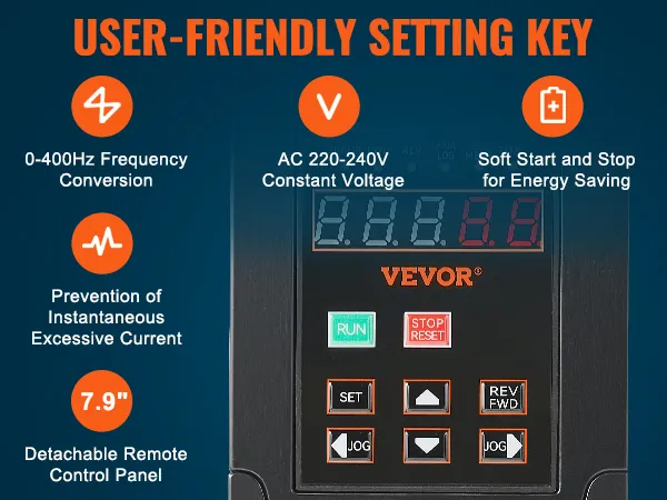 Intuitive Display and Button: Our variable frequency drive (VFD) features an intuitive display and easy-to-use buttons, allowing users to get started quickly. The detachable panel can be connected to the corresponding interface for remote control, providing added convenience and flexibility.