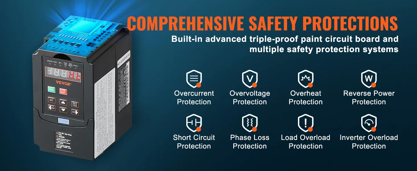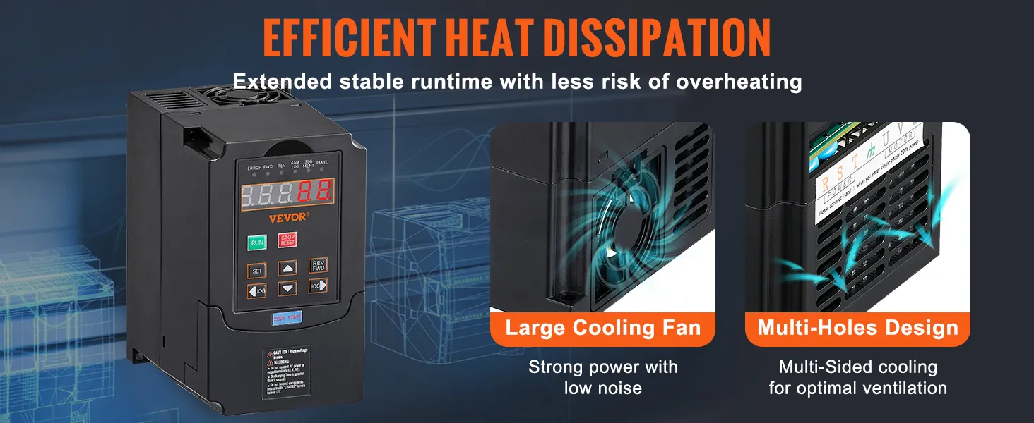 Safety & Durability Redefined: The VFD stands out with a comprehensive protection system, safeguarding against overcurrent, overload, overvoltage, phase loss, and more. These features prioritize your safety and enhance the longevity of the VFD. It ensures rapid cooling during extended use with its multi-sided and multi-hole design.