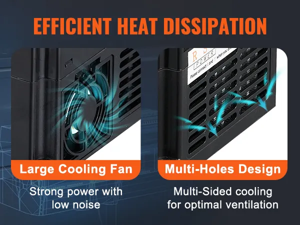 Stable and efficient operation relies on large cooling fans and a multi-hole heat dissipation design, preventing overheating and overloading during extended operation.