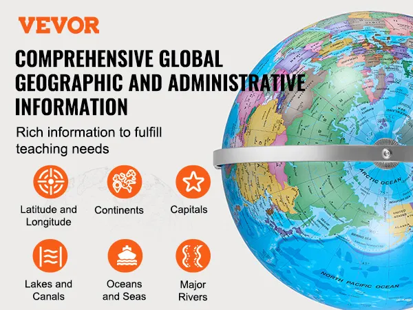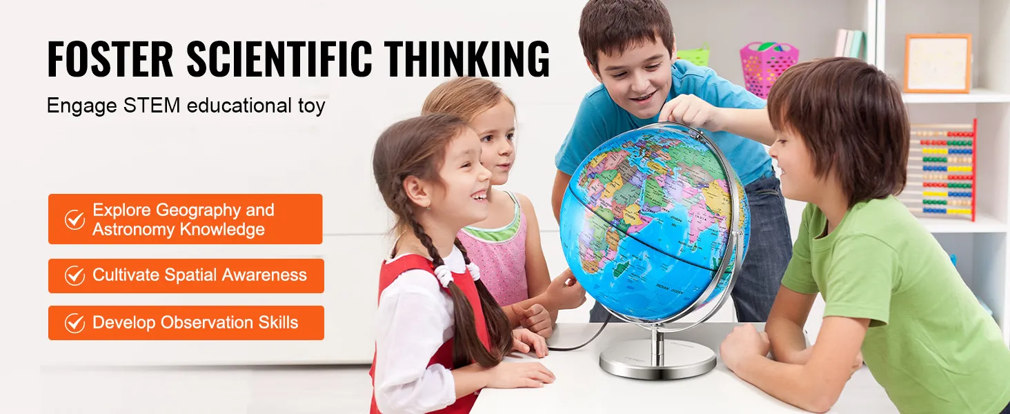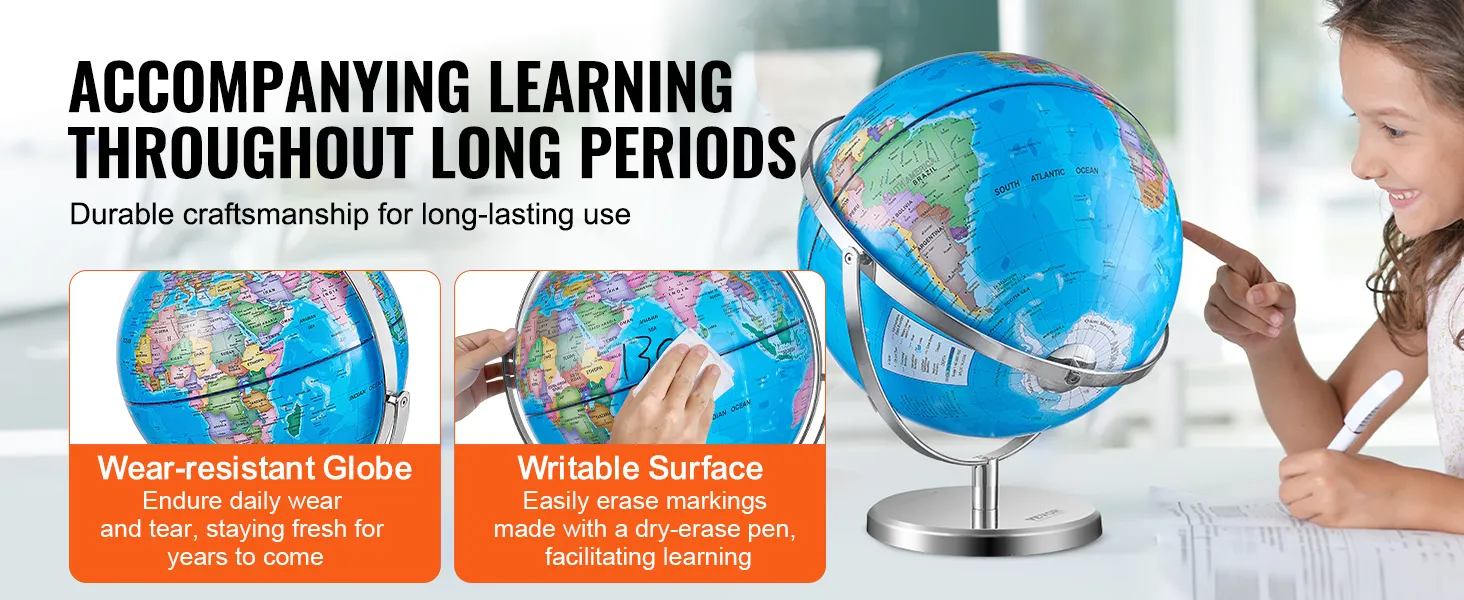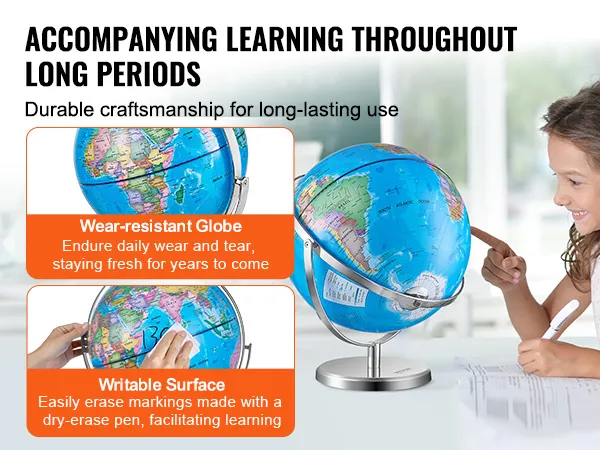 De VEVOR-wereldbol draait 720°, waardoor kinderen de wereld gemakkelijk kunnen verkennen. Deze functie maakt leren interactief en leuk. Kinderen kunnen de wereldbol draaien om verschillende landen en bezienswaardigheden te vinden. Soepele rotatie draagt ook bij aan de tactiele leerervaring. Het helpt kinderen om informatie beter te onthouden, zich te verdiepen in de planeet en in hun eigen tempo te leren. Bovendien zorgt de draaifunctie ervoor dat verschillende delen van de aarde gemakkelijker te bekijken zijn. Deze wereldbol is ideaal voor zowel onafhankelijke als begeleide leersessies.